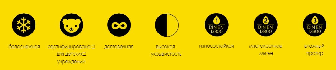 При выборе краски потребителей часто волнуют вопросы водостойкости материала, его плотность, долговечность и возможность использования на детской мебели. Желая донести эту информацию до покупателей простым языком, мы разработали систему пиктограмм. Лаконичные символы расположились на крупной информационной плашке с лицевой стороны упаковки.