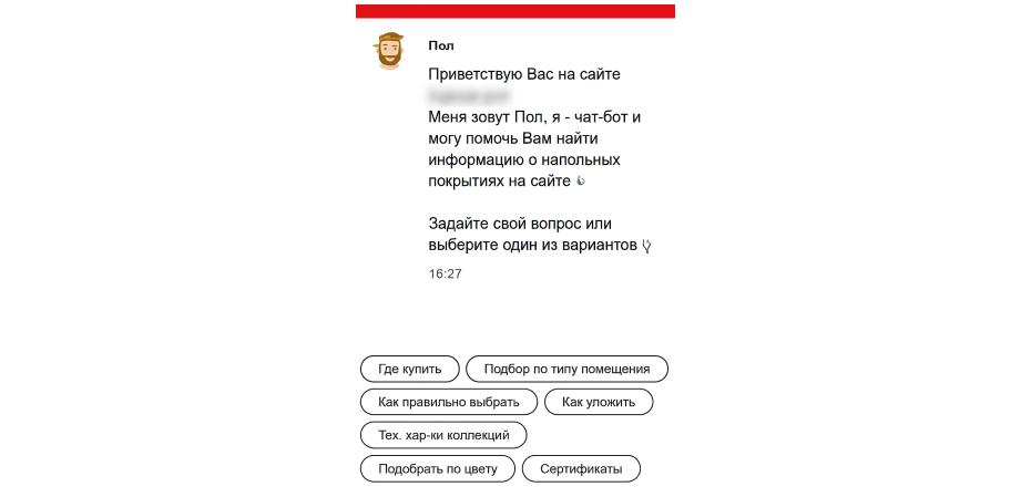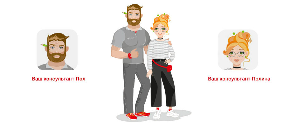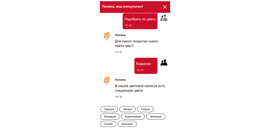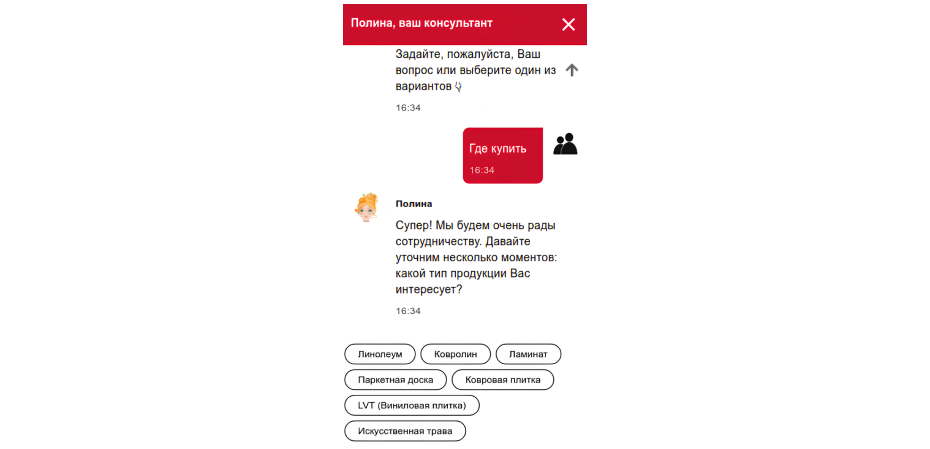 Полина — романтичный дизайнер, работает с конечными покупателями. Помогает подбирать покрытия по цвету, цене, типу помещения и стилю интерьера, дает рекомендации по сочетанию материалов. При первом посещении сайта пользователю показывается баннер с двумя персонажами. Сделанный выбор сохраняется в cookie, чтобы при следующем визите автоматически подключался нужный ассистент (с возможностью смены).