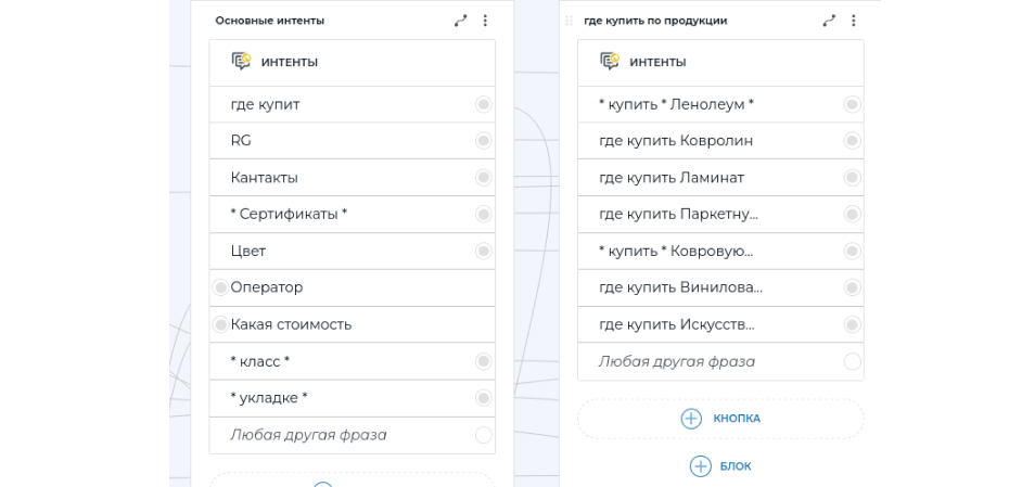 Перенос сценариев в визуальный конструктор, настройка кнопок, условий и реплик. В результате получилась гибкая структура общения, готовая к тестированию.