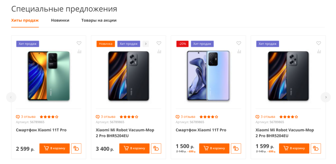 Инфоблоки со стикерами на карточках товаров. Добавили возможность отображения специальных стикеров на карточках товаров. Эти стикеры могут быть настроены по цвету и тексту, что позволяет выделять определенные товары или предложения.