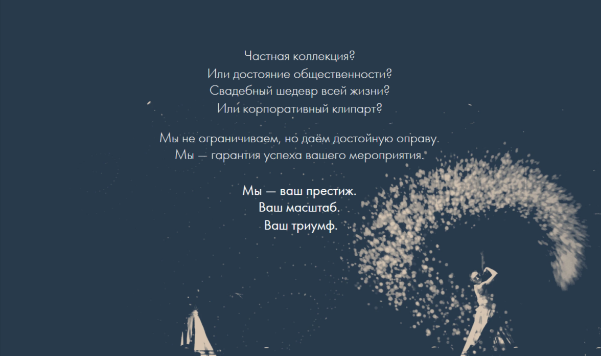 с корпоративными и частными клиентами, предоставляя им выбор. Она позволяет воплощать в реальность идеи любой степени масштабности с привлечением любых мастеров в любых пространствах с одинаково высоким уровнем профессионализма.