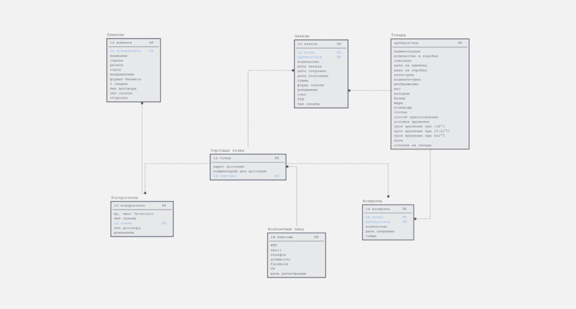 Проанализировали структуру справочников: товары, контрагенты, юридические лица, торговые точки, прайс-листы с разным видом цен и скидок.