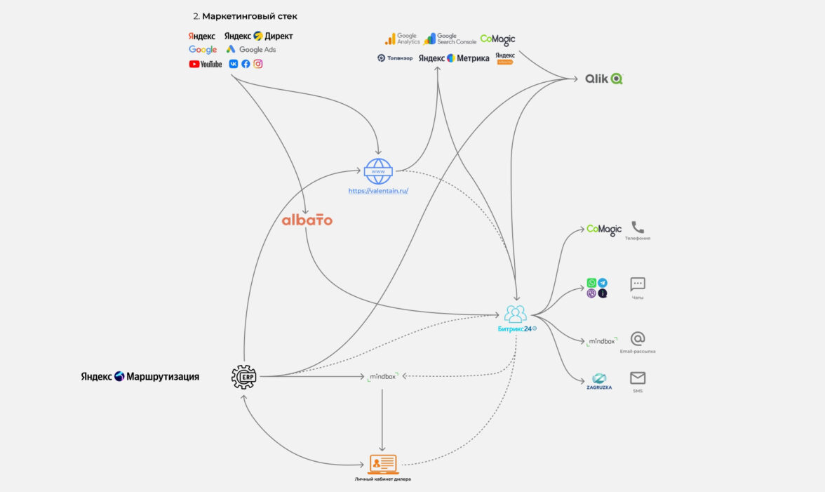 1С <→ Сайт/ЛК <→ CRM Битрикс24 <→ Маркетинговые сервисы <→ Чат-боты.Настроили двунаправленную синхронизацию клиентских данных и заказов, что позволяет актуализировать данные как в 1С, так и в CRM и Личном кабинете.