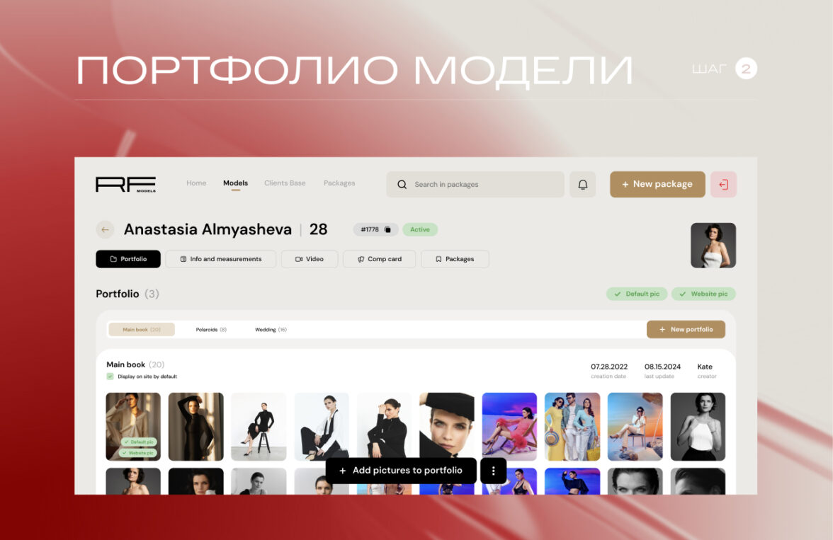 Если Packages — это поток, то Models — это база данных. Тут есть все параметры, портфолио и то, что в конечном счете покупает клиент. В RFMODELS база уже на 200+ моделей, и в такой системе нельзя позволить себе дубли, разные версии одних и тех же фото.
