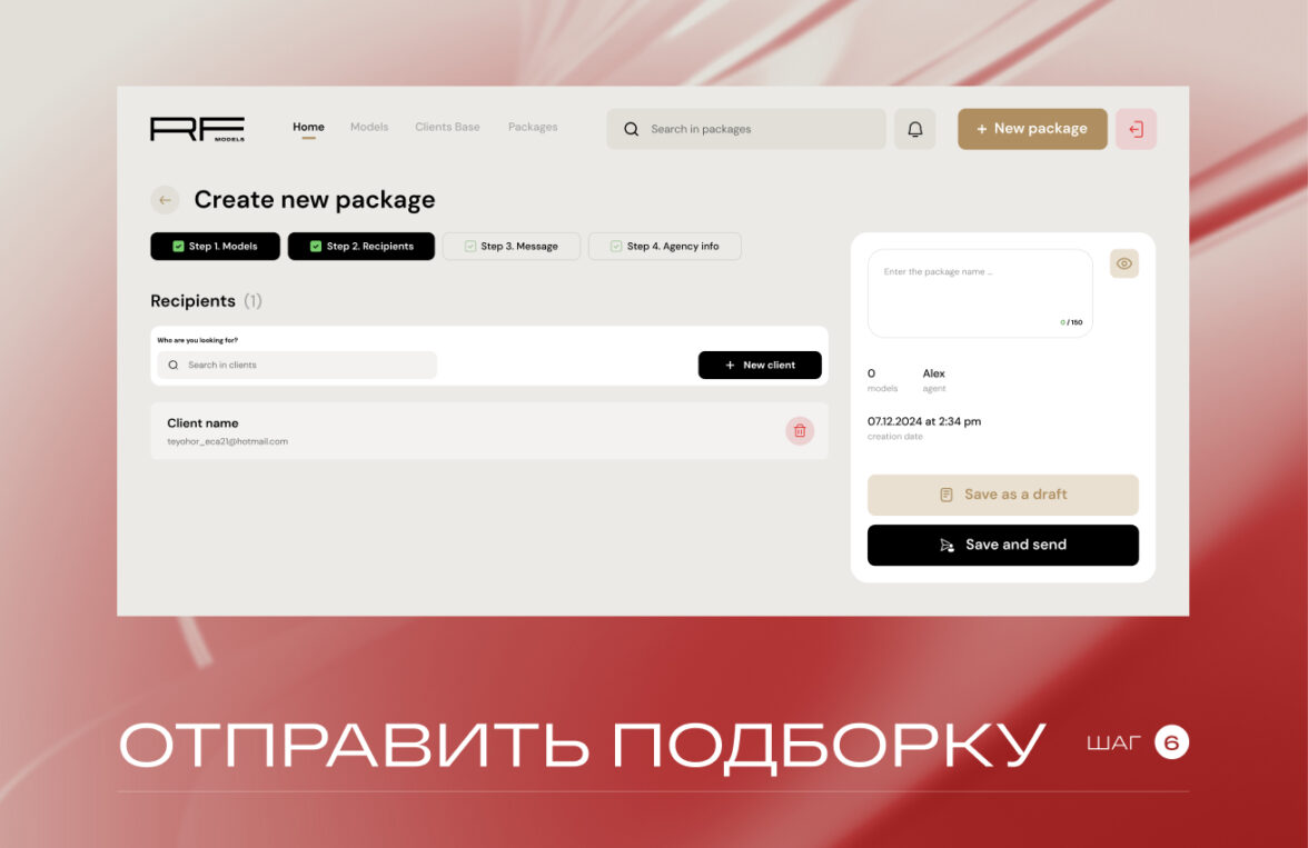 сборка по шагам: Models → Recipients → Message → Agency info;