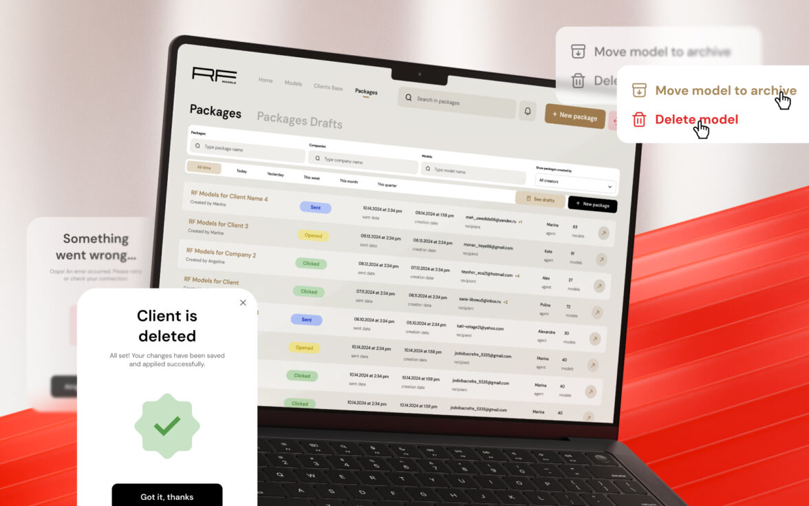 В ИТОГЕ RFMODELS ПОЛУЧИЛ НЕ ПРОСТО АДМИН-ПАНЕЛЬ, А ЛИЧНЫЙ И УПРАВЛЯЕМЫЙ ВЕБ-СЕРВИС, КОТОРЫЙ ОБРАБАТЫВАЕТ 200+ МОДЕЛЕЙ В БАЗЕ И ОКОЛО 500 ПОДБОРОК В МЕСЯЦ, ЧТОБЫ РАБОТА С ПОРТФОЛИО, КЛИЕНТАМИ И СТАТИСТИКОИ БЫЛА БЫСТРОЙ, ПРЕДСКАЗУЕМОЙ И ОТВЕЧАЛА ВСЕМ БИЗНЕС-ПРОЦЕССАМ.