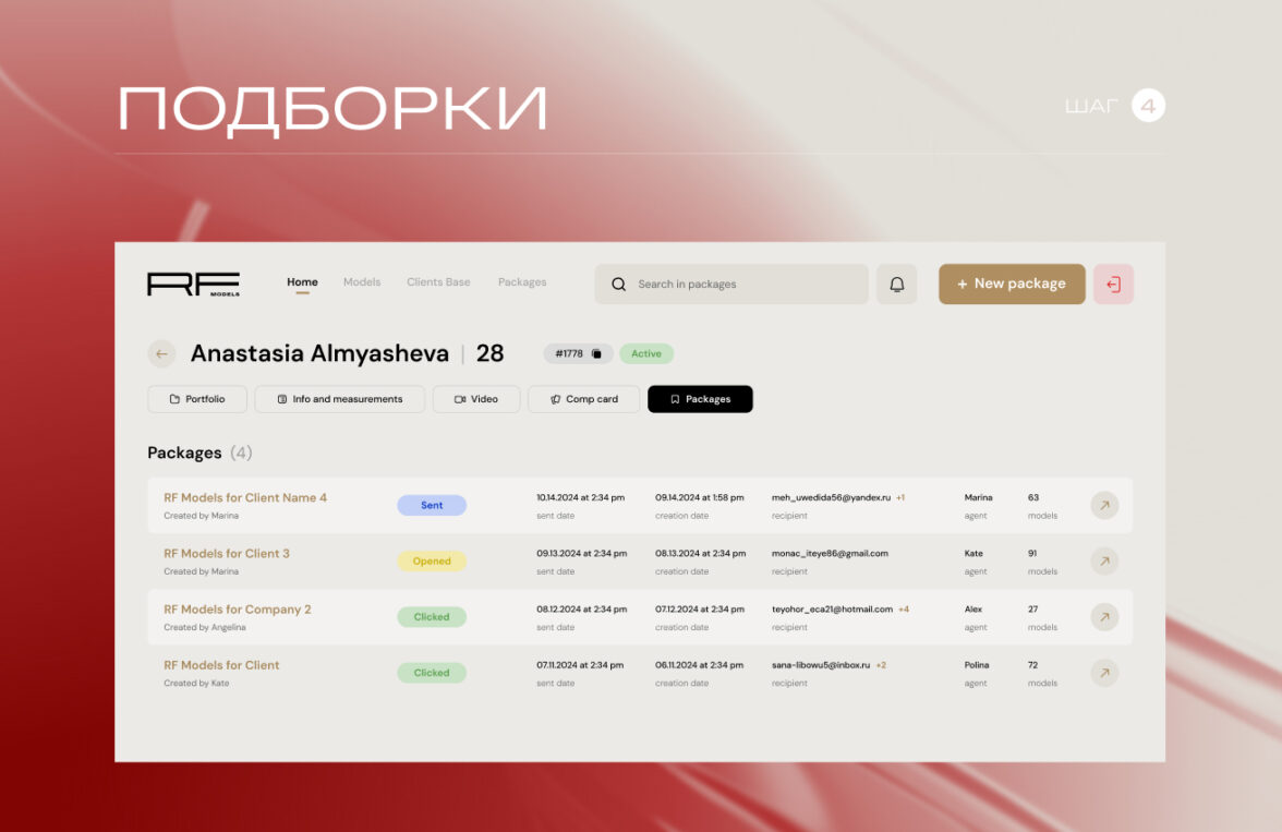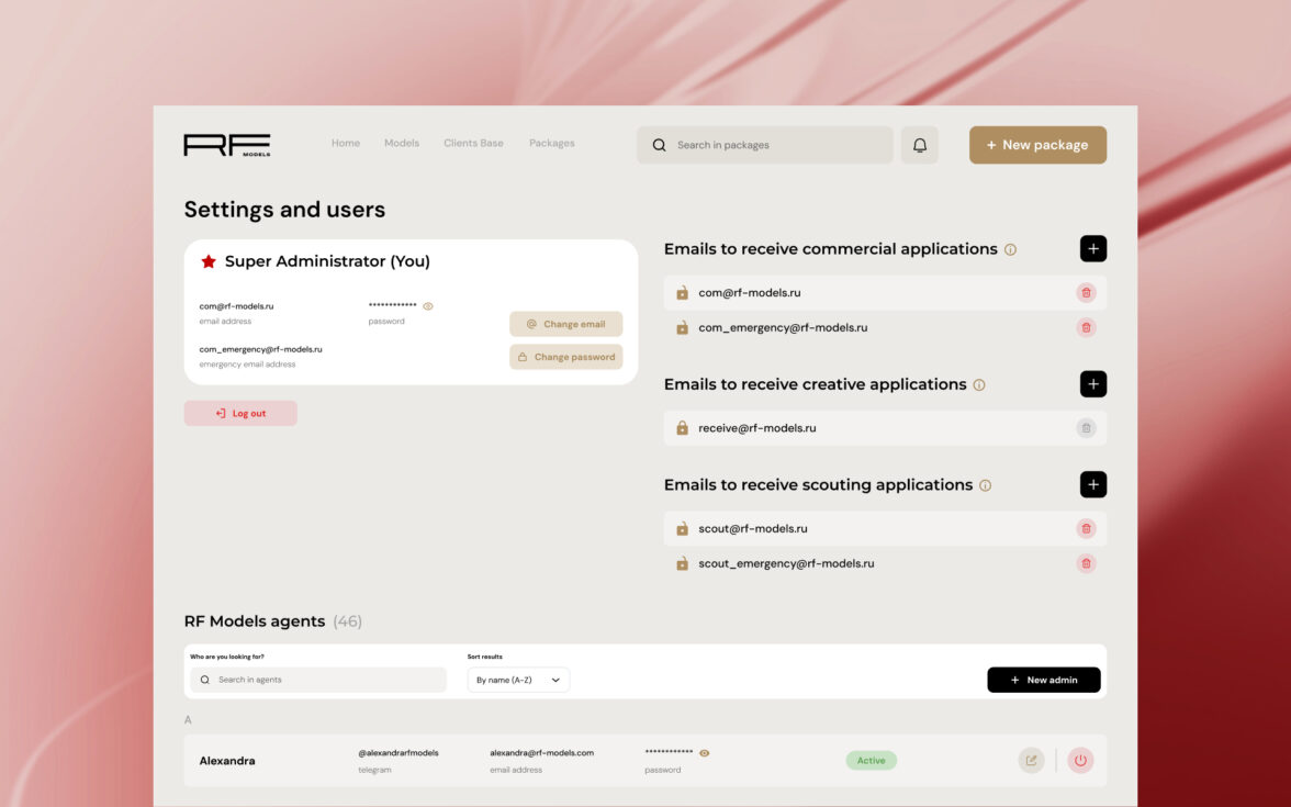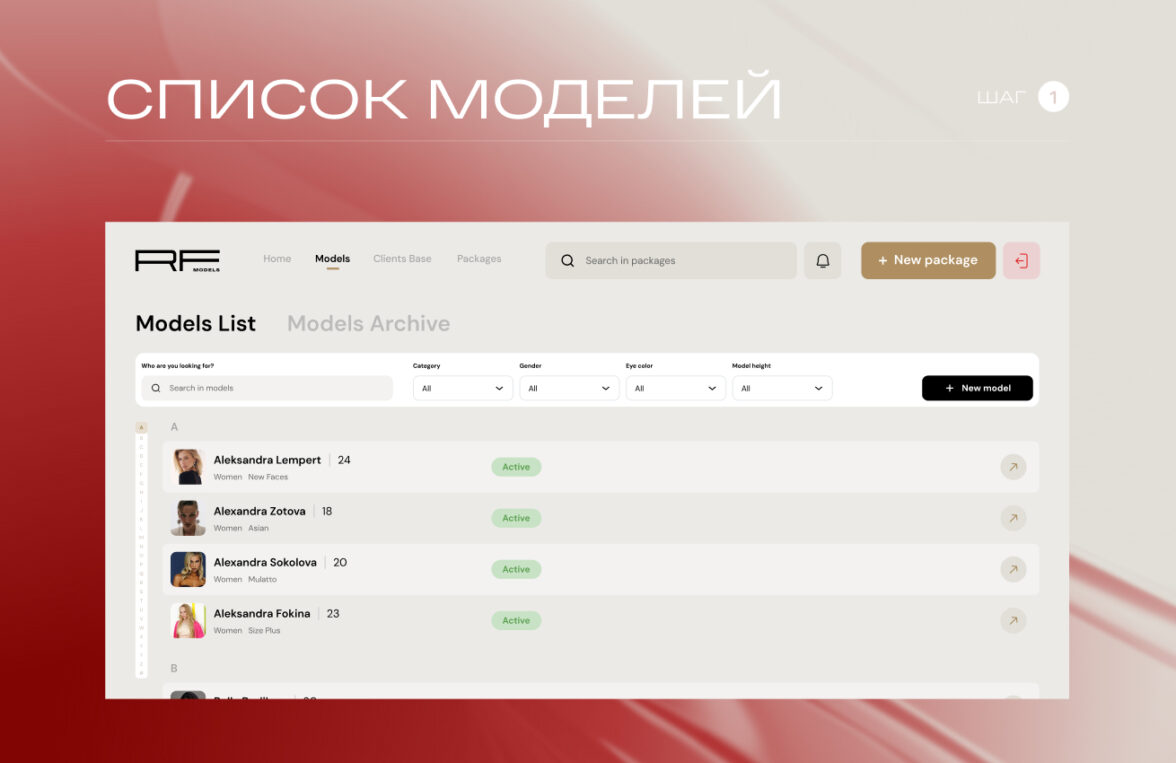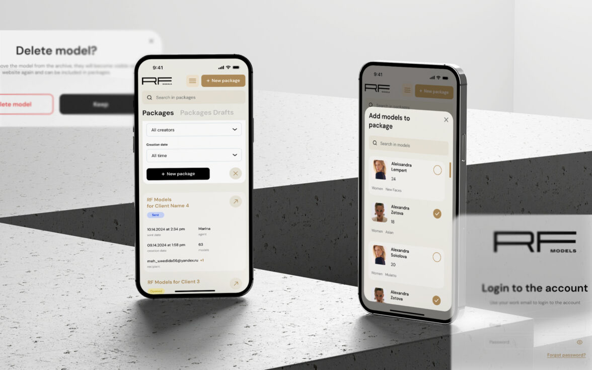 RFMODELS — крупный игрок рынка, у которого ошибка в управлении портфолио стоит дорого: не только времени менеджера, но и качества выбора клиента. До проекта агентство работало через Mediaslide (который по ощущениям застрял где-то в 00-х), как единую базу моделей для букинга и отправки портфолио, но сервис уперся в 3 ограничения:
