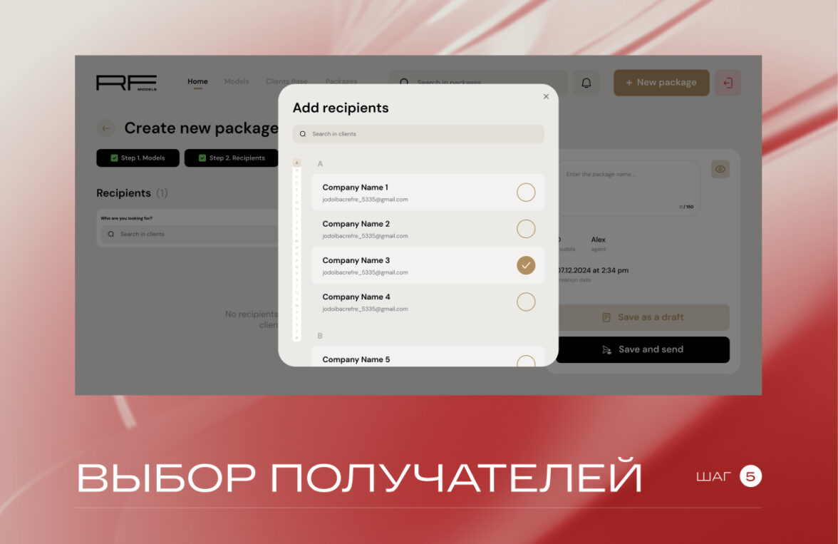 Мы сделали сборку подборки предсказуемой и быстрой всего в 4 шага, которые можно заполнять в любом удобном порядке или пропустить ненужные в данный момент: выбор моделей из базы, выбор получателей, текст и детали отправки, предпросмотр, чтобы менеджер видел итог глазами клиента.