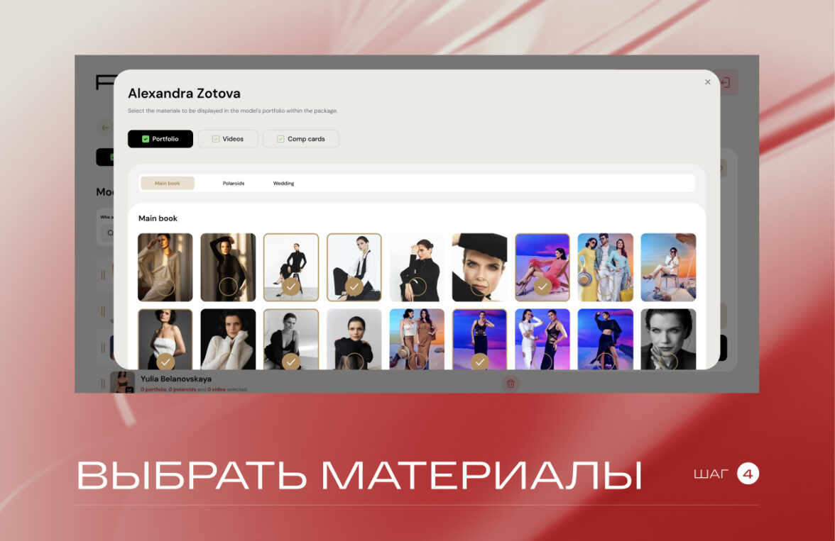Решение в UX логике: фото и видео загружаются один раз в карточку модели, дальше менеджер просто собирает подборки из готовой базы. Это резко снижает рутину и риск ошибок.