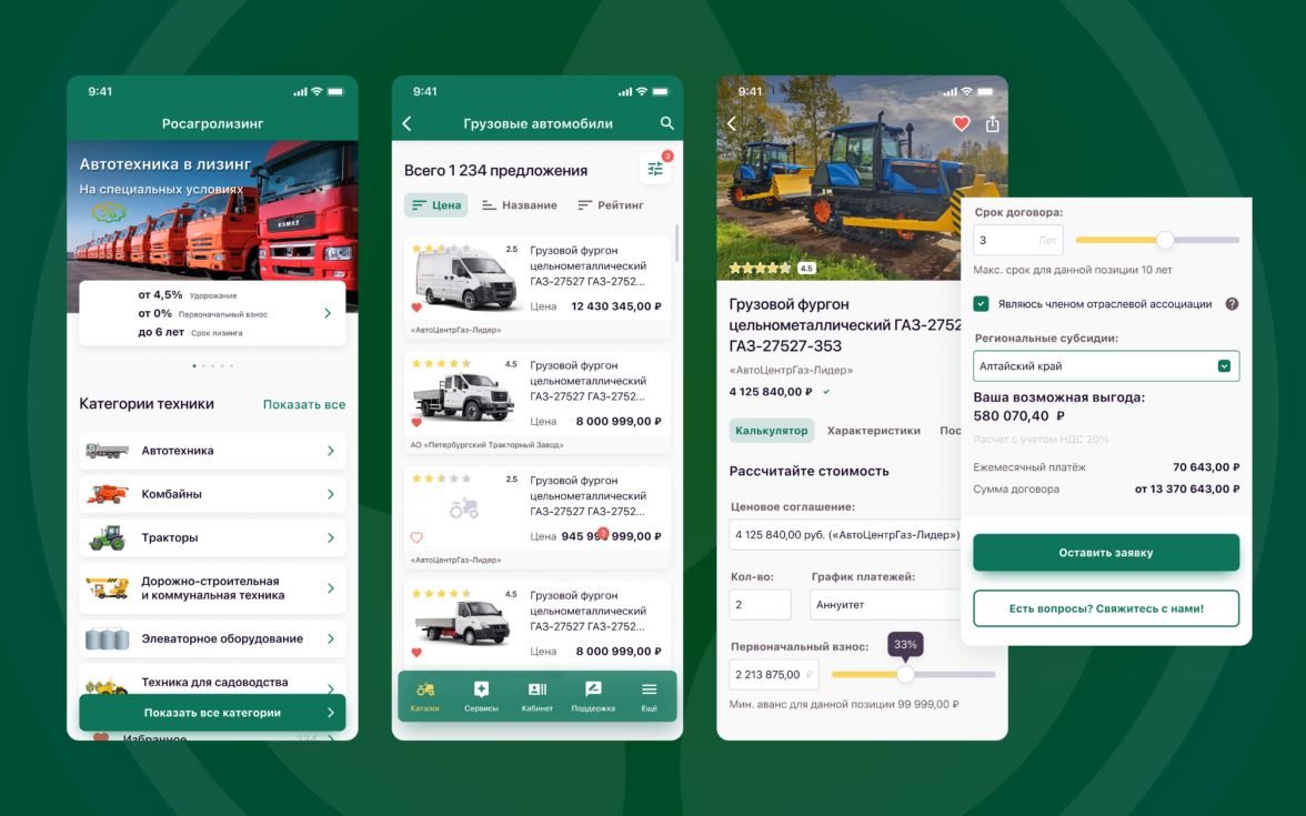 Нельзя было игнорировать и тот факт, что компании, занимающие лидирующие позиции на рынке оказания лизинговых услуг, уже имели свои мобильные приложения, а их клиенты охотно в них регистрировались. Таким образом, было принято решение разработать маркетплейс для клиентов «Росагролизинг».