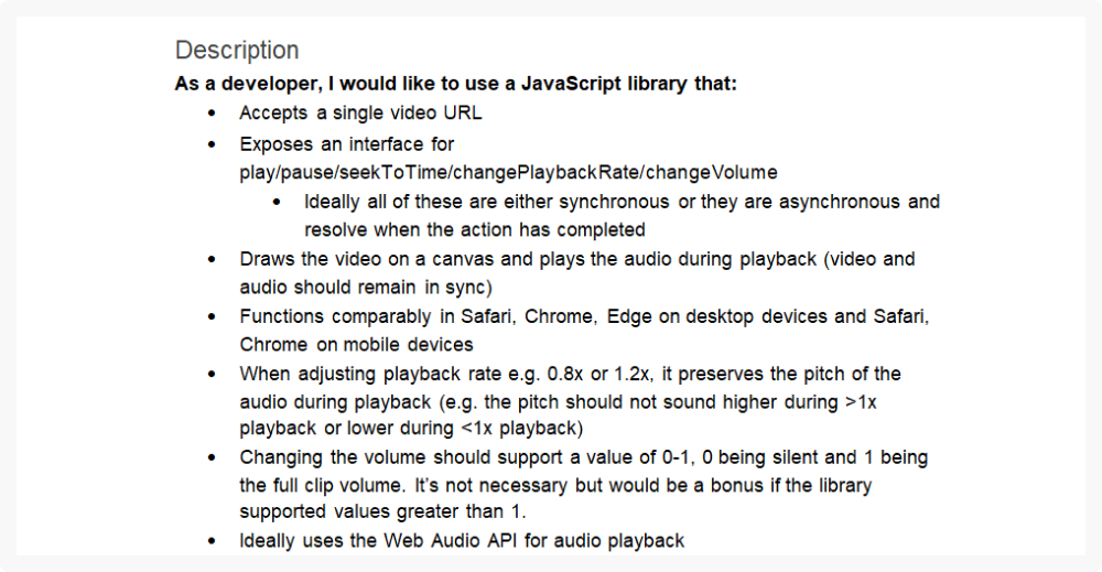 Заказчик хотел плеер, который будет работать стабильно в десктопных версиях Safari, Chrome, Edge и на мобильных устройствах в Safari и Google Chrome. Кроме того, нужно было сохранить качество (высоту) звука видео при изменении его скорости. Показываем часть ТЗ:
