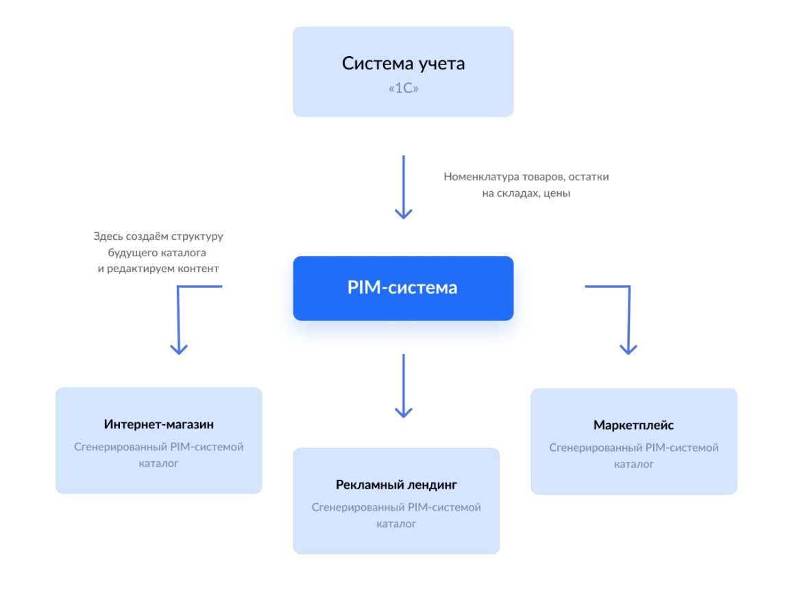 Работа с товарами строится на базе «1С». Это осложняет работу с каталогом. Номенклатуру в «1С» формируют категорийные менеджеры, которые называют категории товаров так, как удобно им. Для пользователей b2c-магазина такие формулировки не понятны. Также PIM-система должна быть адаптирована для работы с маркетплейсами, а у них свои списки категорий, которые не совпадают с каталогом компании. Перестраивать свои бизнес-процессы под сервис заказчик не хотел.