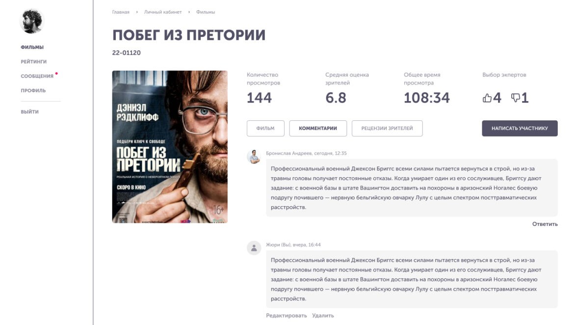 На странице «Фильма» для членов жюри отображается стандартная для всех страниц фильма информация о фильме, а также встроенный плеер проигрывания, блок голосования (художественная ценность, актерская игра, операторская работа, графика, монтаж, режиссерская работа). В блоке оценок предусмотрена итоговая оценка, показывающая средний балл по всем оценкам. Также есть блок «Заметки», где члены жюри могут оставлять комментарии по выбранному фильму. Добавлена кнопка «Просмотрено», чтобы перевести фильм в статус «Просмотренных» и продолжить участие в конкурсе.