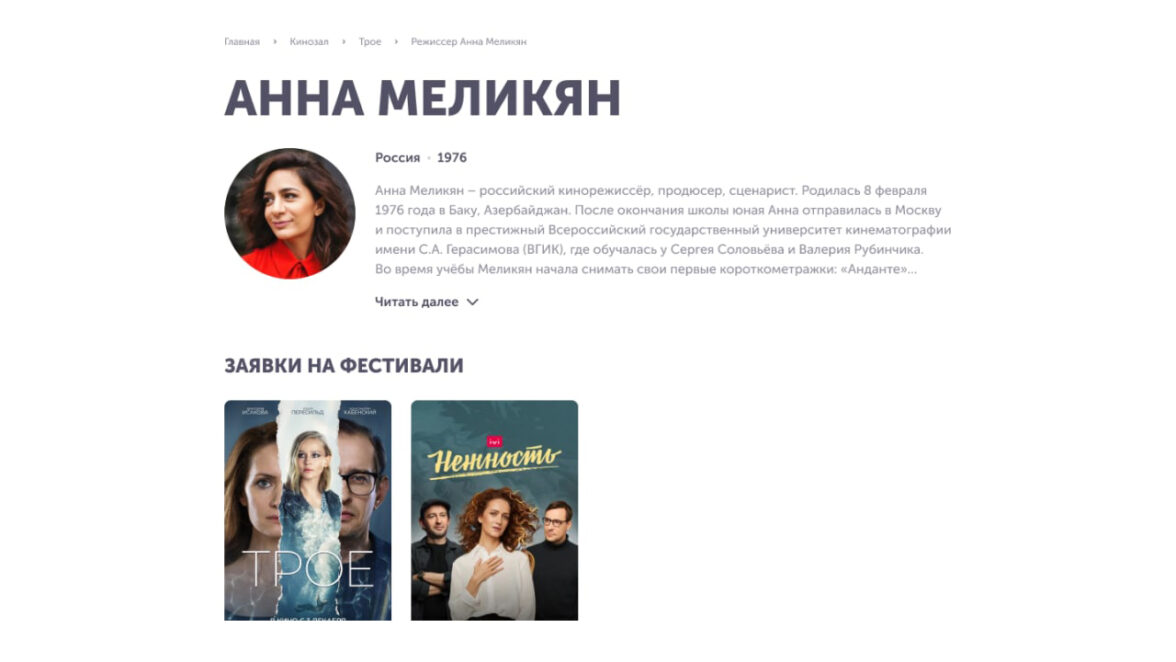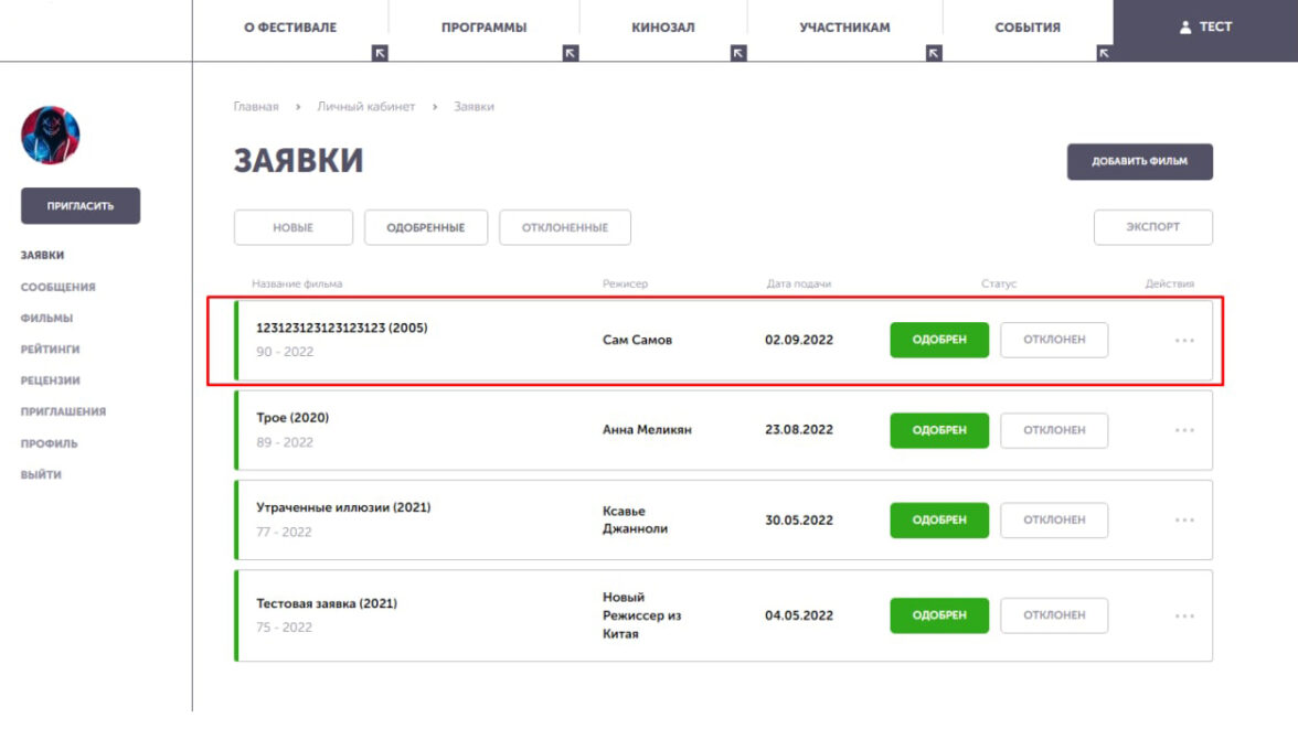 Карточка режиссера содержит редактируемые элементы (фото, фамилия, имя, страна, год рождения, регалии, фильмография, текстовое поле для биографии). Список фильмов, заявленных ранее на фестиваль, заполняется автоматически.