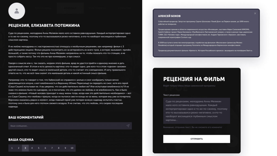 Мы разработали личный кабинет с широким функционалом для добавления и структурирования фильмов фестиваля, обмена сообщениями, оценки фильмов. Пользователей разделили на несколько ролей. Постарались упростить взаимодействие, сделать использование кабинета простым и понятным. Разработали нужные страницы сайта для индивидуальной презентации и онлайн-просмотра фильмов.
