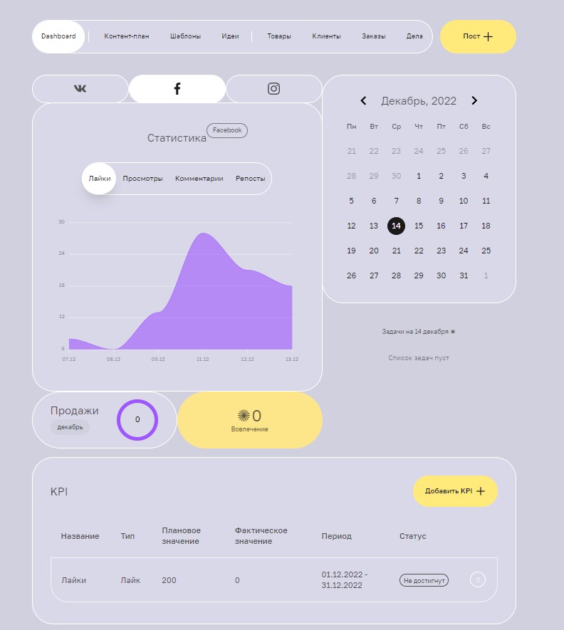7. Дашборд. Здесь пользователь видит сводку актуальной информации: количество продаж, активность пользователей в каждой из соц сетей, графики поведения и KPI. Помогает быстро оценить текущий прогресс и посмотреть ближайшие запланированные публикации.