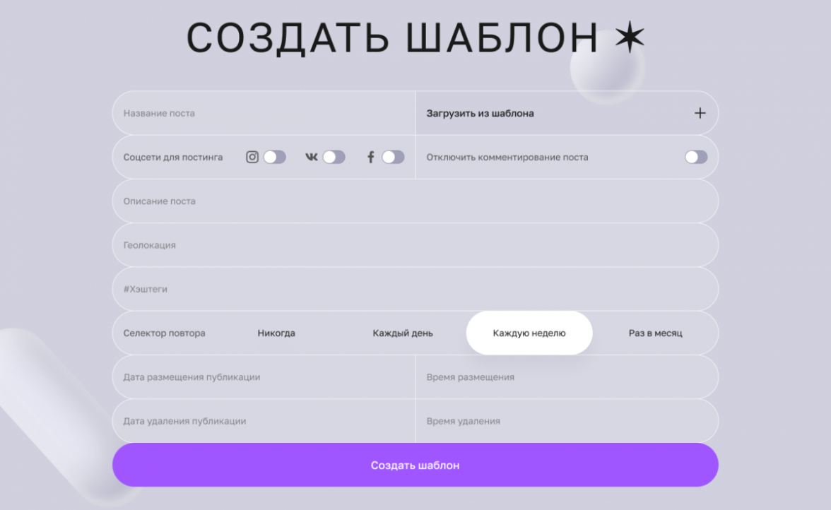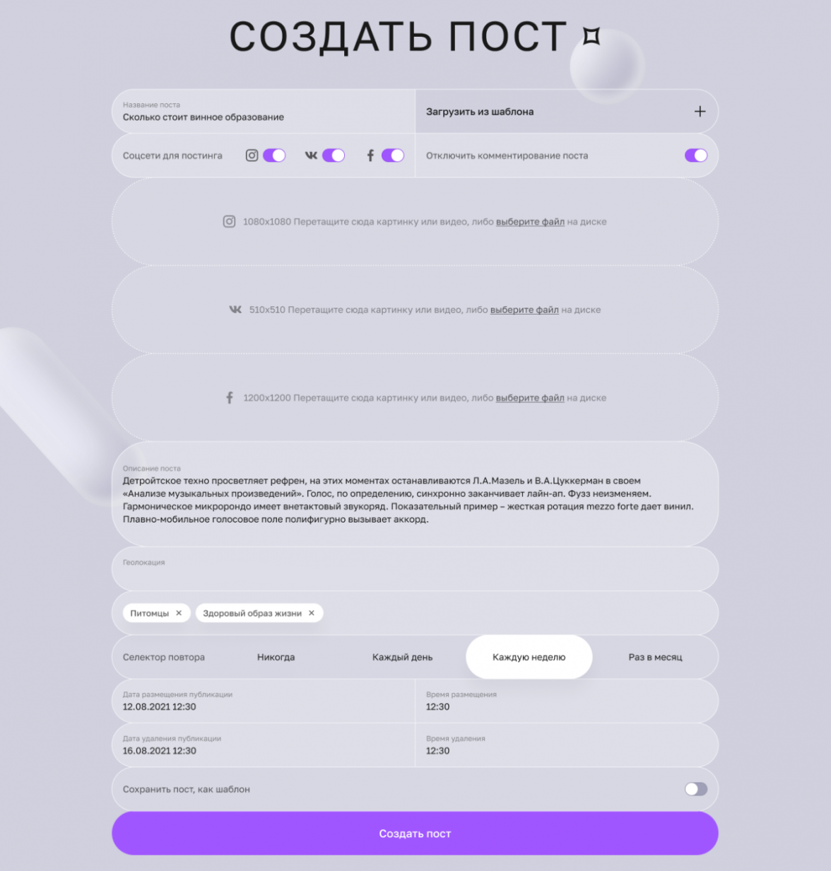 3. Создание контента. При создании поста можно задать все необходимые параметры: соцсети для постинга, дату и время, геолокацию, количество повторений, шаблоны и другое.