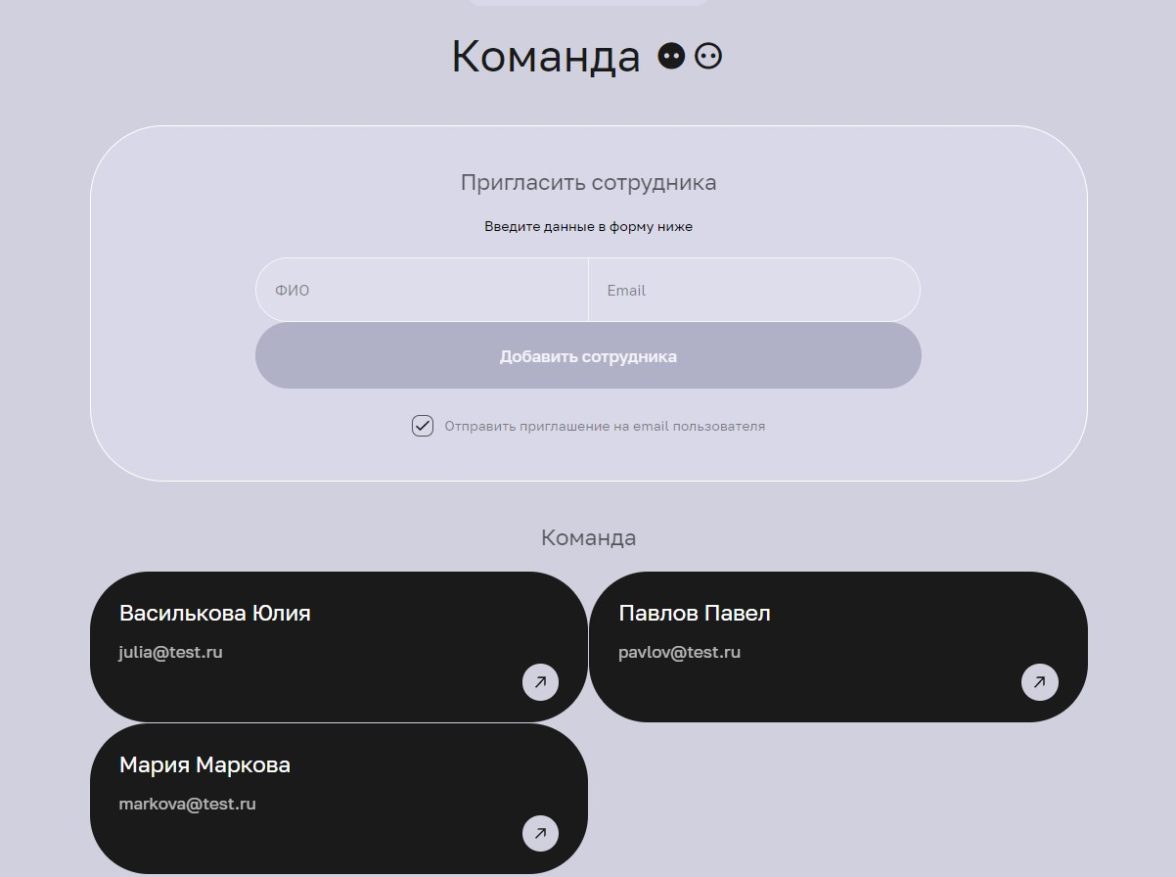 Сначала пользователь регистрируется, покупает нужный ему тариф (но у подписки есть и пробный период) и создаёт проект. Следующий шаг — создание команды под проект.