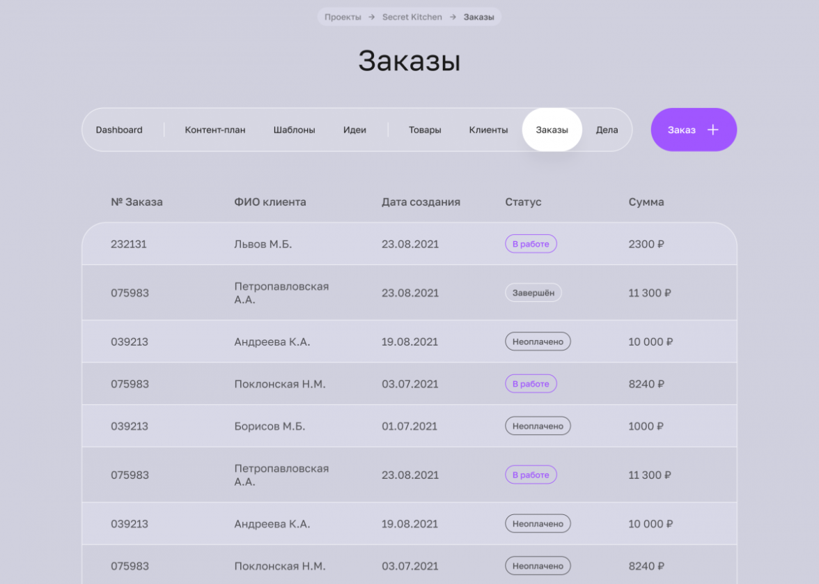 6. Заказы. В Spire есть функциональность, которая позволяет вести учёт по заказам и оплатам. Данные обо всех заказах собраны в специальной вкладке.