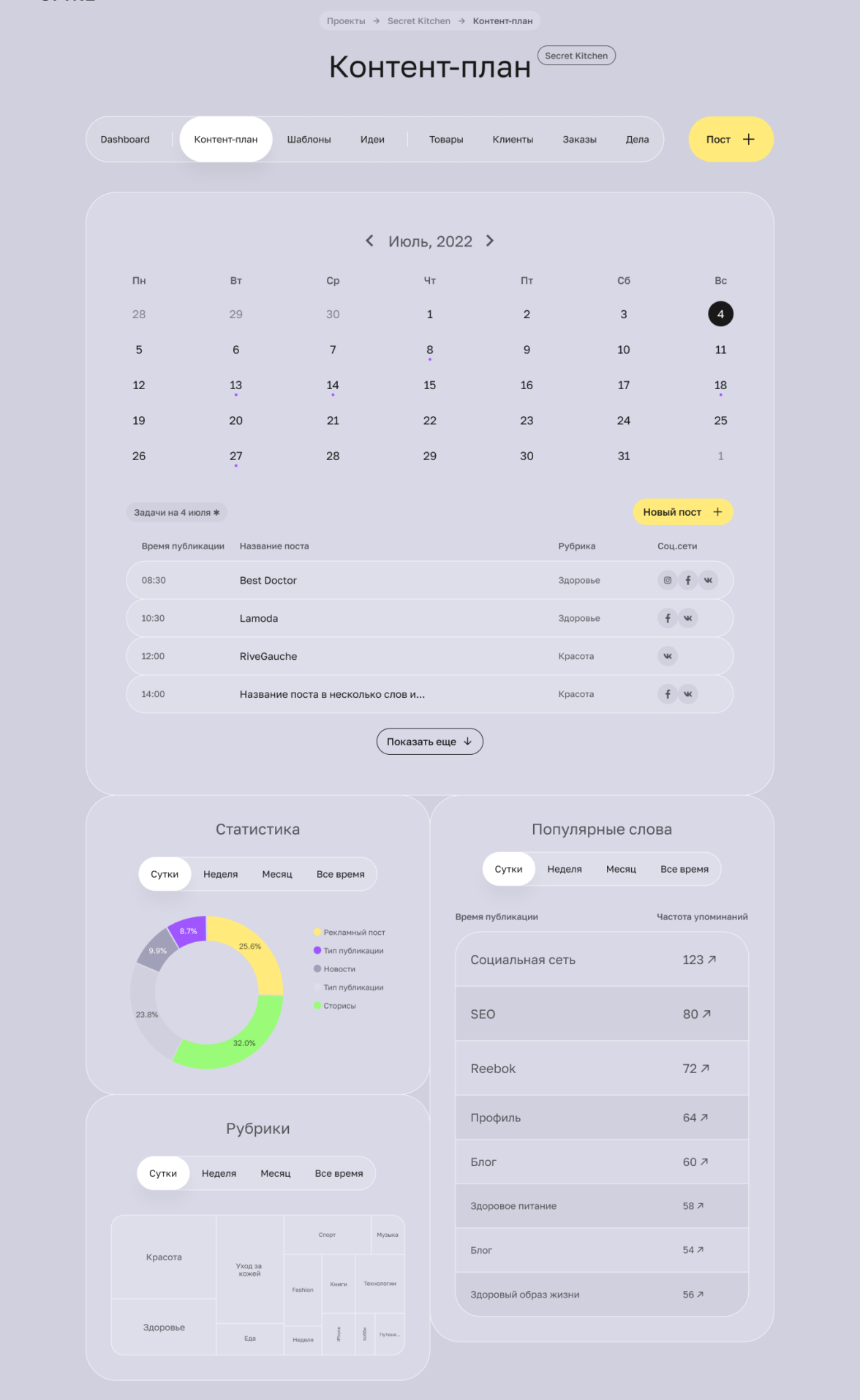 Заказчик хотел создать сервис, который будет помогать бизнесу, блогерам и фрилансерам грамотно планировать свое продвижение через социальные сети и анализировать его результаты. Основной фишкой сервиса станет автоматизация размещения контента и обширная аналитика: чтобы можно было все постить и анализировать в едином интерфейсе.