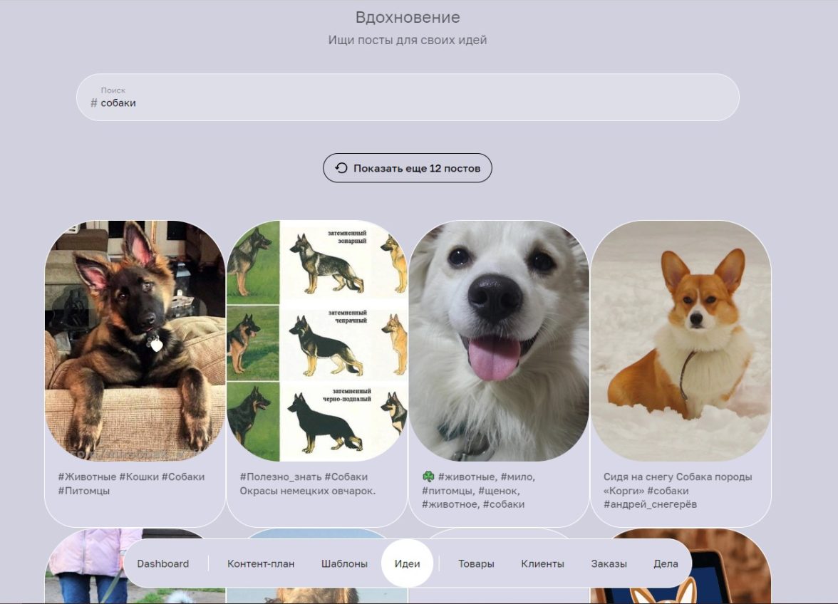 Для создания контента предусмотрено всё самое нужное — загрузка постов и расписание автопостинга, создание шаблонов, поиск вдохновения через хэштеги и создание креативных досок с помощью встроенного Miro. А во внутреннем календаре можно удобно планировать контент и ставить задачи.
