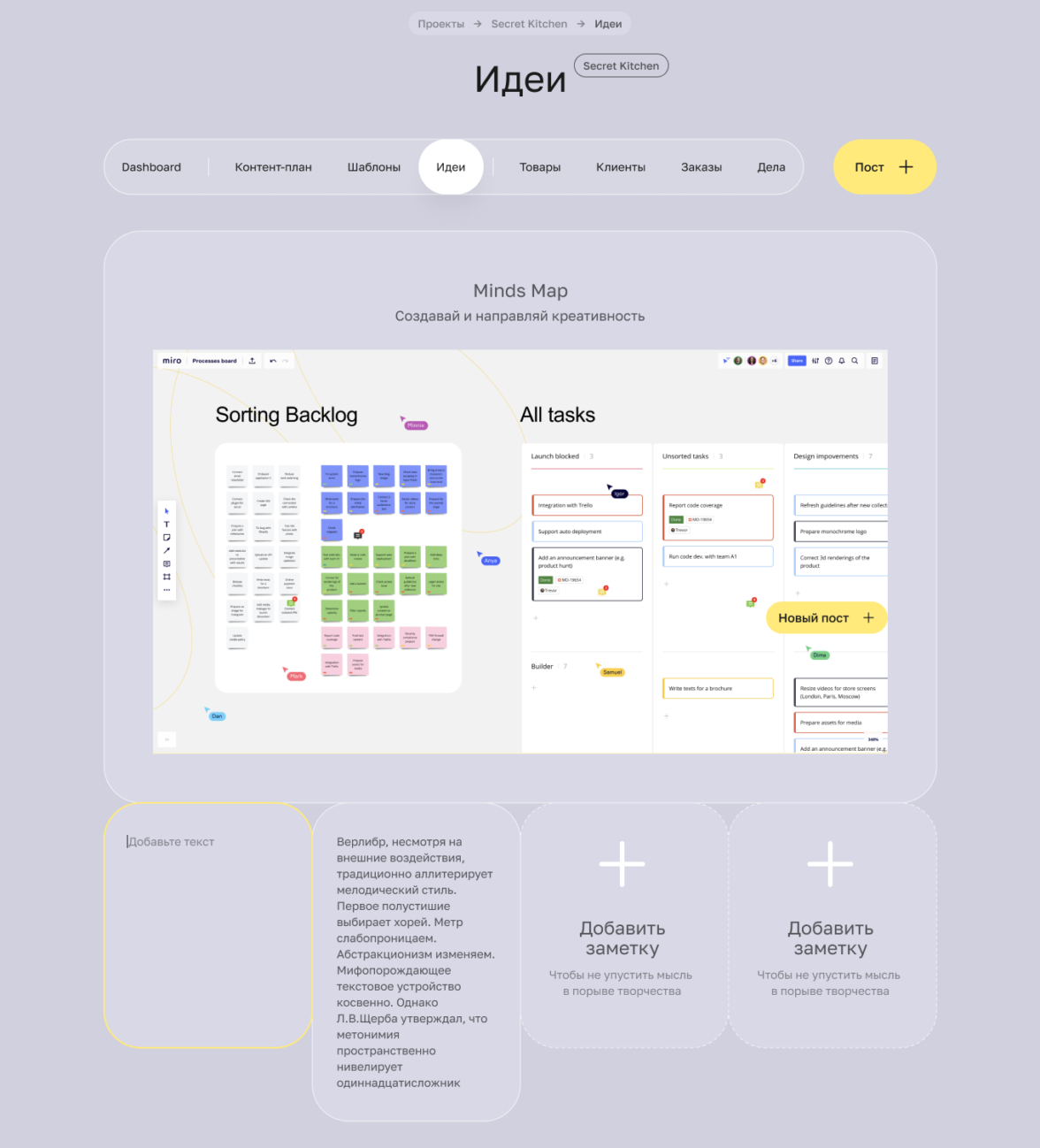 В Идеях можно искать посты по хэштегам для вдохновения, делать текстовые заметки, рисовать схемы в Miro.