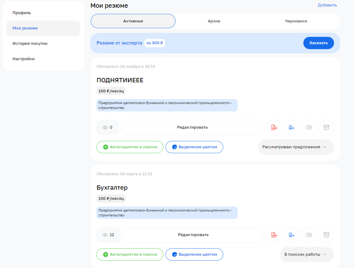 Для соискателя есть три платные возможности: автоподнятие резюме, визуальное выделение карточки резюме в общей выдаче, составление резюме экспертами.