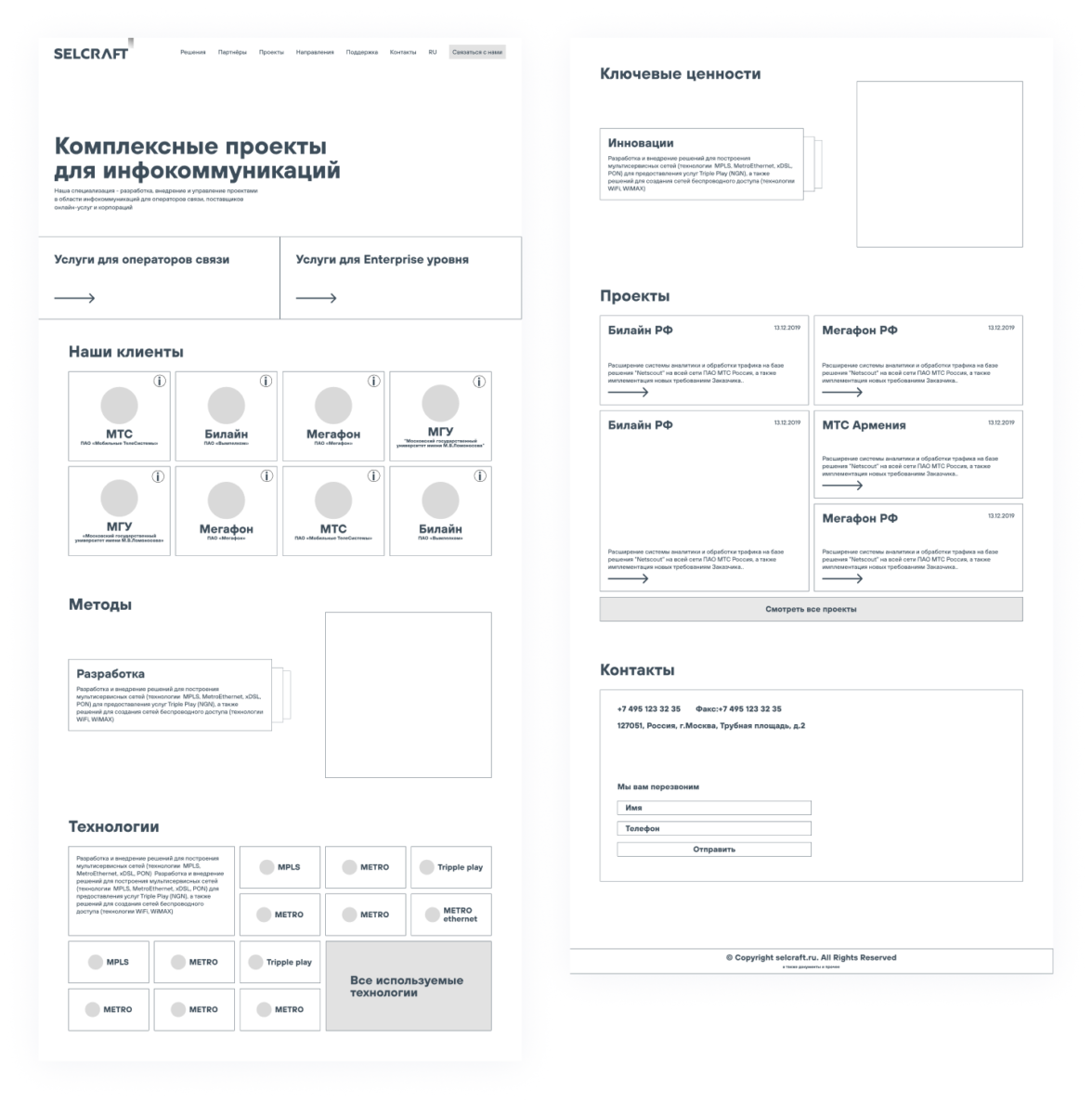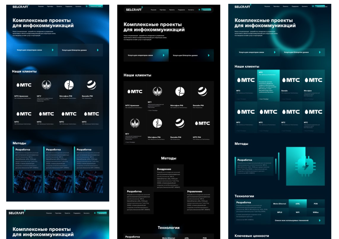 Компания Selcraft обновили бренд-айдентику, разработали брендбук. Но сайт остался в старом сеттинге и нуждался в полной переработке: он не отражал современный имидж компании и её серьёзный опыт. Клиенты Selcraft — крупные и известные компании, например, операторы мобильной связи, такие, как: МТС, Билайн, Мегафон, Ucell и другие.