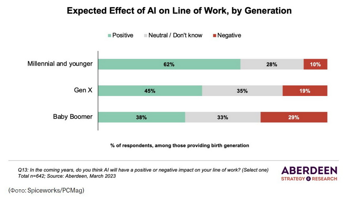 Среди респондентов миллениалов и моложе (1981 года рождения или позже) 62% считают, что ИИ положительно скажется на их работе. Это значительно больше, чем среди поколения X (1965 — 1980 гг. рождения), где о потенциальной пользе ИИ заявили 45% опрошенных и бумеров (1946 — 1964 гг. рождения) — 38% респондентов.