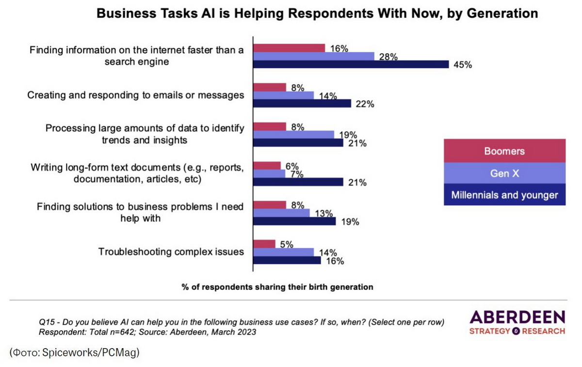 В ходе исследования многие миллениалы и молодые респонденты заявили, что они уже используют ИИ-инструменты на работе. Например, чтобы быстрее находить информацию в поисковиках (45%), писать и отвечать на письма (22%), изучать большие объемы данных и выявлять тренды (21%), писать длинные документы (21%), искать решения бизнес-проблем (19%).