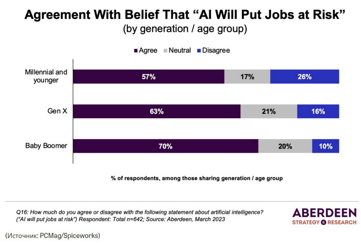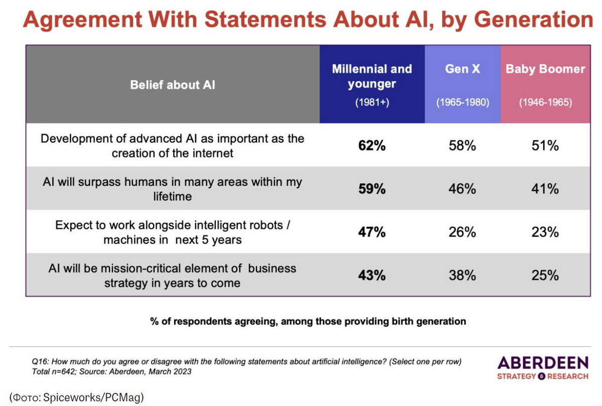При этом большинство опрошенных независимо от возраста читают, что появления ИИ так же важна как создание интернета. так считают 62% миллениалов, 58% представителей поколения X и 51% бумеров.