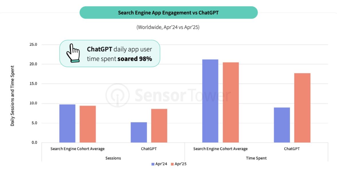 Вовлеченность пользователей ChatGPT и традиционных поисковых систем. Синий цвет — апрель 2024 года, оранжевый — апрель 2025 года. Левая половина: число сессий для поисковых систем и для ChatGPT. Правая половина: время, проведенное в приложении для поисковых систем и для ChatGPT. На рисунке также указано, что средний пользователь ChatGPT cтал проводить в приложении на 98% больше времени в апреле 2025 года по сравнению с апрелем 2024 года.