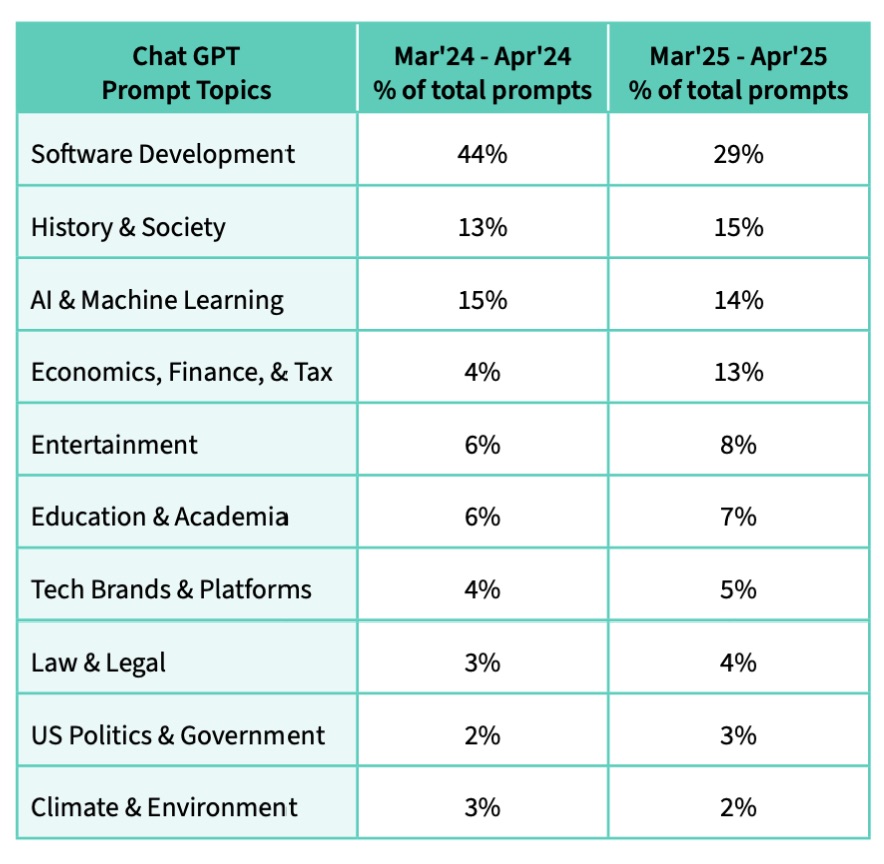 В марте-апреле 2024 года почти половина (44%) от общего числа запросов к ChatGPT было связано с разработкой программного обеспечения. Год спустя таких запросов стало менее трети (29%). При этом выросла доля числа запросов, связанных с экономикой, финансами, налогами (с 4% до 13%). В меньшей степени, но также выросло число запросов, связанных, с развлечениями (с 6% до 8%), образованием и наукой (с 6% до 7%), технологическими брендами и платформами (с 4% до 5%), историей и обществом (с 13% до 15%), юридическими вопросами (с 3% до 4%), политикой и действиями правительства США (с 2% до 3%).