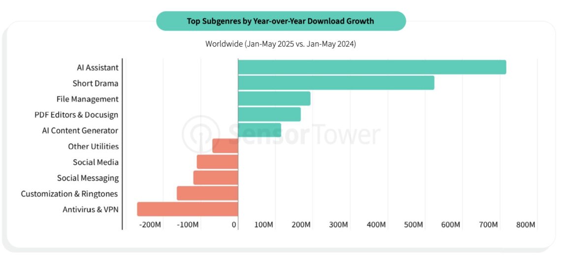 Кроме чат-ботов увеличение числа загрузок в первые пять месяцев 2025 года по сравнению с первыми пятью месяцами 2024 года показали также мобильные приложения следующих жанров (в порядке убывания): просмотр мини-дорам (в основном за счет азиатских пользователей), управление файлами, работа с документами в формате pdf и электронными соглашениями с электронными подписями, генерация ИИ-контента.