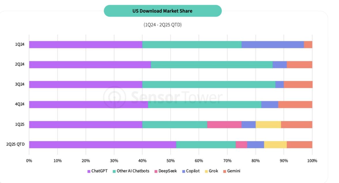 Хотя доклад Sensor Tower носит название «Повседневная эволюция ИИ: растущая роль чат-ботов в жизни потребителей», в основном он посвящен не всем нейросетям, а самой популярной из них — ChatGPT компании OpenAI. Если с первого квартала 2024 года по конец первого квартала 2025 года ChatGPT занимал около 40% рынка чат-ботов в США, то во втором квартале его доля превысила 50%. Ему удалось потеснить даже конкурента, который в начале этого года показывал быстрый рост — DeepSeek (компания, создавшая этот чат-бот носит такое же название).