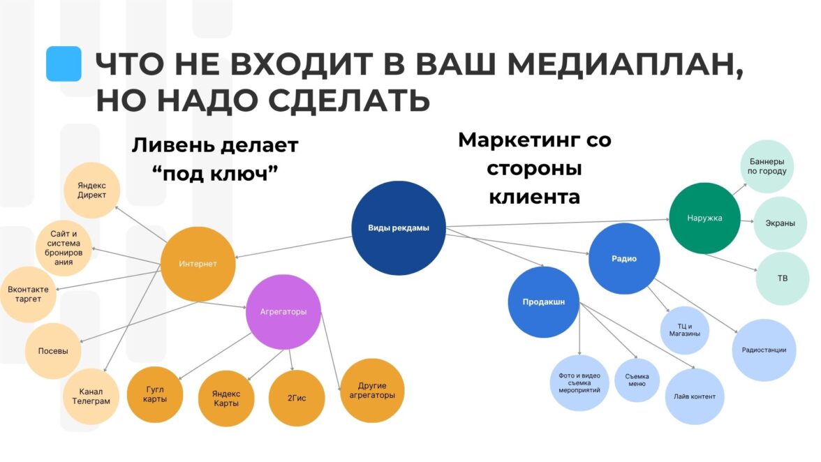 Мы понимаем, какие каналы продвижения помогут клиенту достигнуть его целей. И если в наши бизнес процессы такая работа не входит, то мы ищем партнеров, подрядчиков.