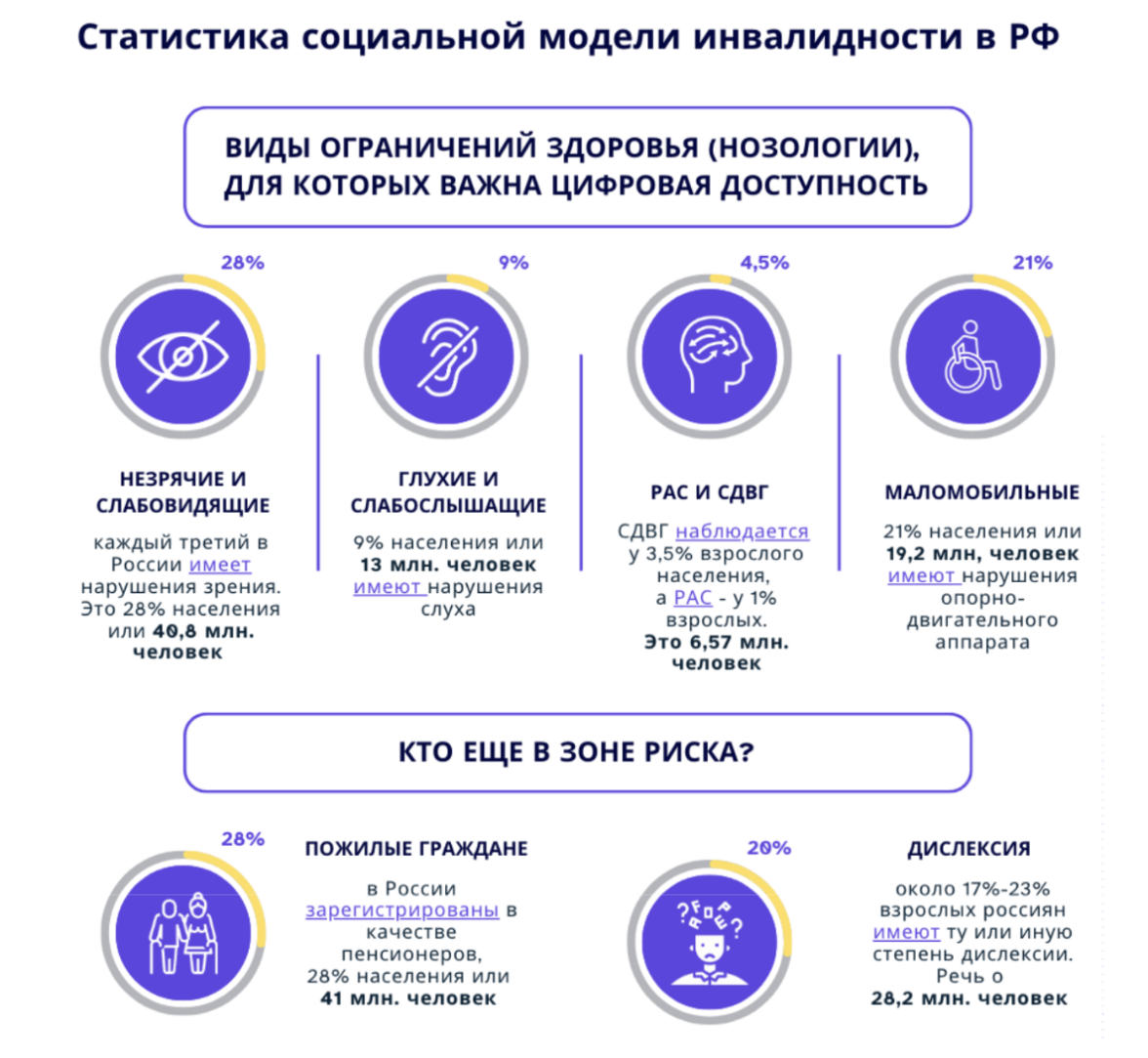Цифровая доступность — это адаптация интерфейсов под нужды людей с различными ограничениями здоровья, будь то слабое зрение, нарушение слуха, когнитивные или двигательные особенности. Но на самом деле, она важна не только для людей с официальной инвалидностью и ОВЗ.