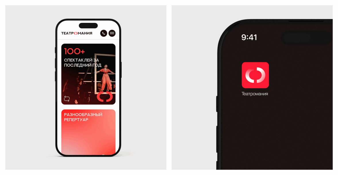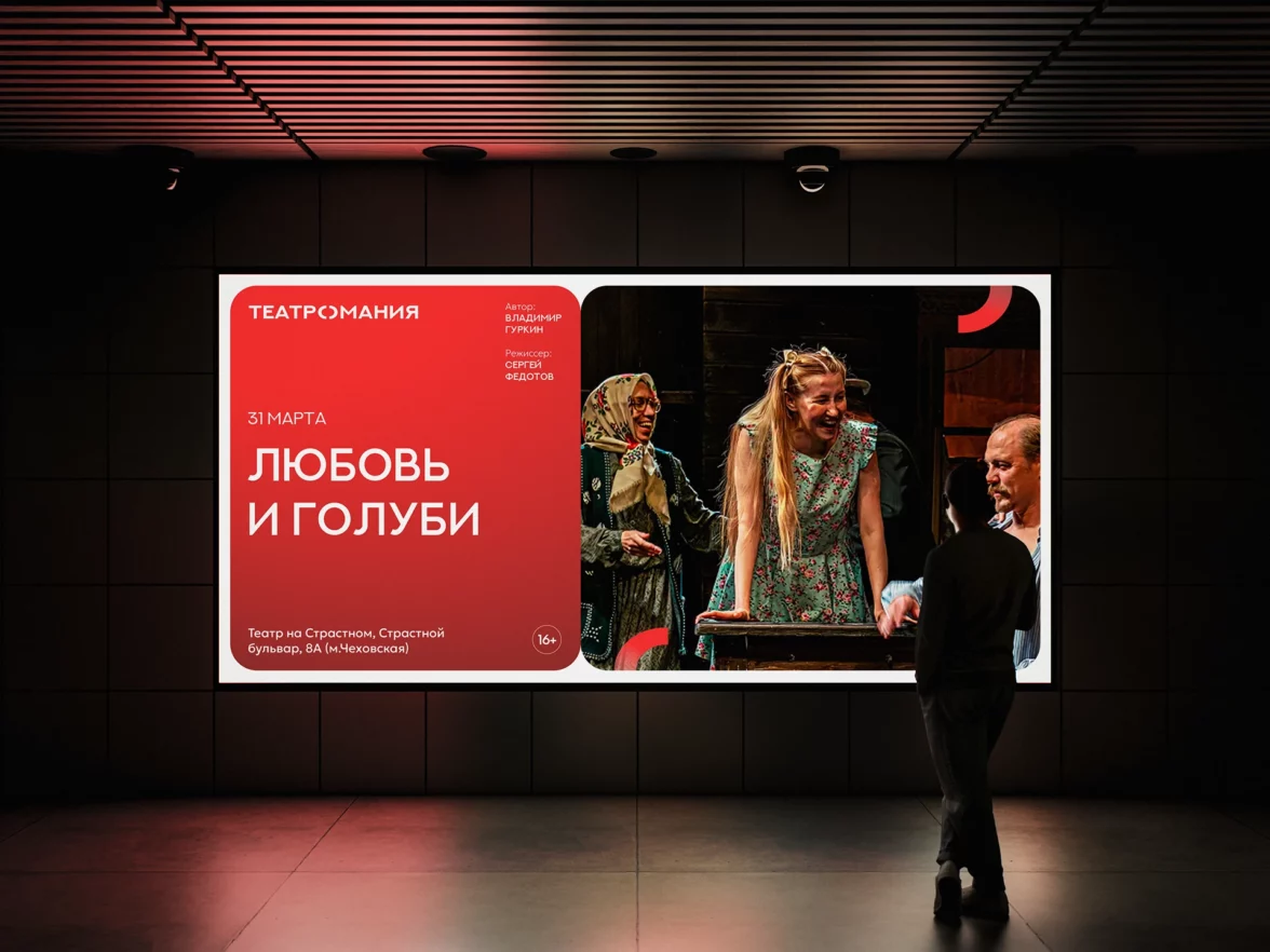 Визуальная концепция «Театромании» выстроена на тщательно продуманных деталях: гармоничном соотношении шрифтов, фирменных геометрических масках, работе с пропорциями и композицией. Такой подход формирует узнаваемый характер айдентики, которая одинаково уверенно работает как в цифровой среде, так и на классических театральных носителях — афишах, баннерах и печатных материалах.