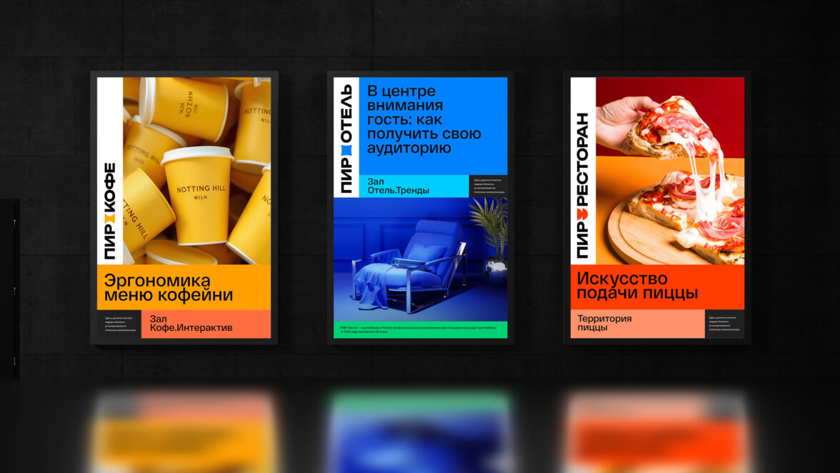 Каждому направлению дизайн-команда присвоила фирменный цвет: оранжевый — для «ПИР—Кофе», красный — для «ПИР—Ресторан», синий — для «ПИР—Отель». При этом айдентику выставки «ПИР Экспо» объединяет красный цвет, который мы сохранили для связи с материнским брендом.