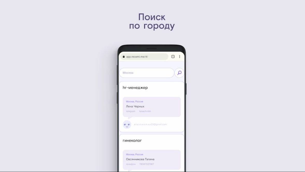 С recomi полезная информация не затеряется в лентах, исчезающих сторис и комментариях соцсетей. Тем более, что работа последних в России нестабильна и всячески ограничивается. Все контакты будут собраны в одном месте. Можно рекомендовать хороших профи друзьям и знакомым и быстро находить нужных людей. Пользователям не придётся гуглить, выпрашивать рекомендации в соцсетях, бесконечно писать кому-то с запросами или полагаться на интуицию. В приложении, которое сейчас в разработке, самообучающаяся система подстроит рекомендации под конкретного пользователя в зависимости от списка его друзей, интересов и других факторов. Можно будет искать профи по рекомендациям близких знакомых, а также отправлять анонимные запросы на конкретных специалистов. А загрузка контактов будет работать в облегченном формате: можно будет не вбивать их вручную, а просто дать доступ к своей телефонной книге. Алгоритм сам определит специалистов и предложит ими поделиться.