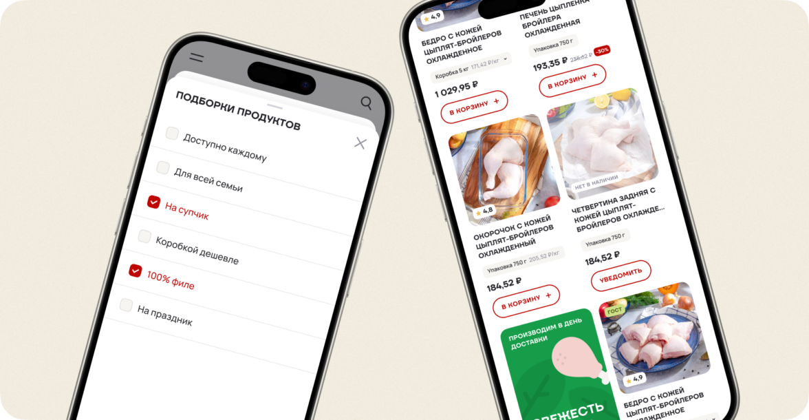 Помимо привычных фильтров мы добавили теги. Теперь подобрать продукты «на супчик» можно без постоянного заглядывания в рецепт, а просто настроить фильтр. Важная механика на сайте — доступность дат для доставки товара, которую мы лакончино вписали и в карточки каталога.