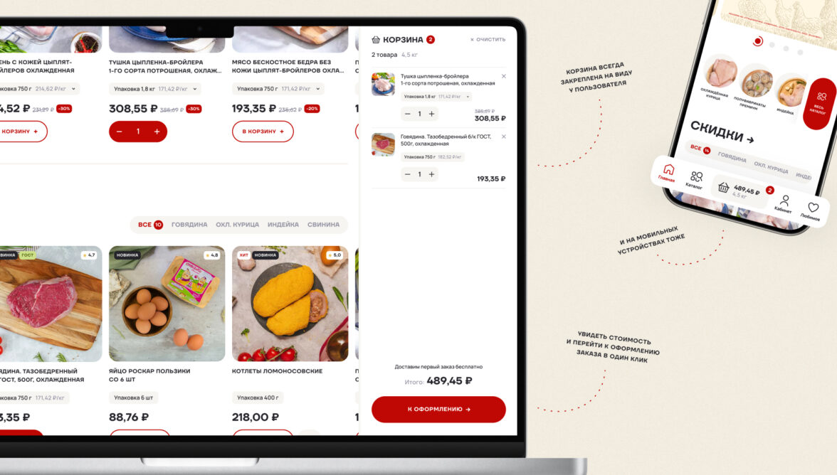 Когда вы идете по магазину, то катите тележку впереди или несете корзину в руках. Всегда можете глянуть, что вы уже положили в нее. Этот принцип мы реализовали и в интернет-магазине. Корзина всегда видна справа на десктопе и вызывается кнопкой и убирается смахиванием на мобильных.