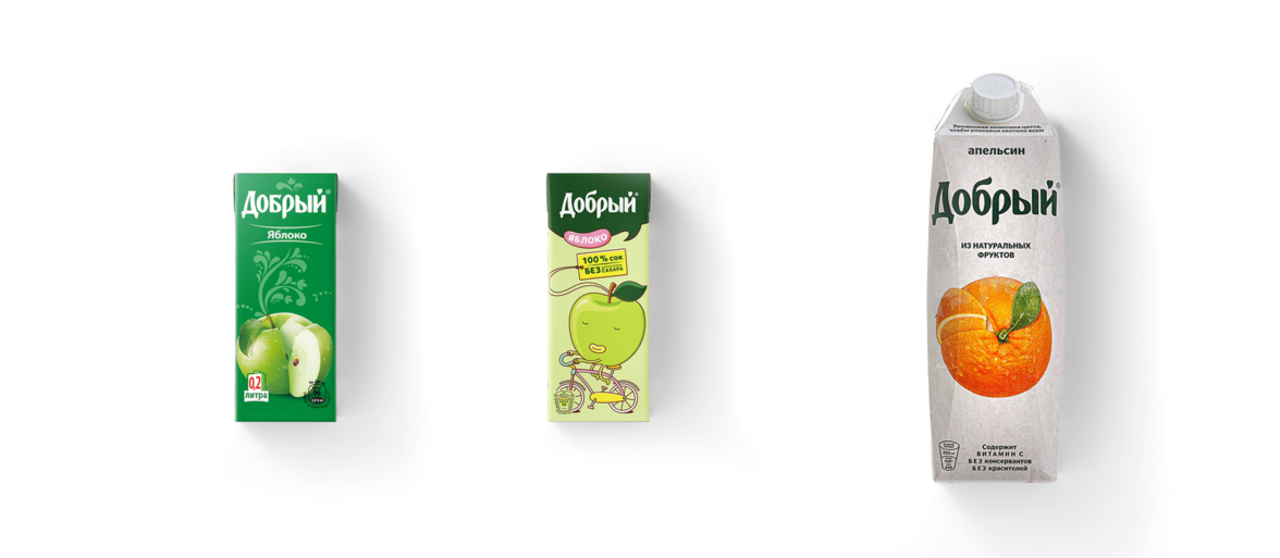 Компания «Добрый» неоднократно меняла дизайн упаковки. В магазине можно было встретить как невзрачную белую коробку с изображением фрукта, так и яркие упаковки с милыми персонажами.