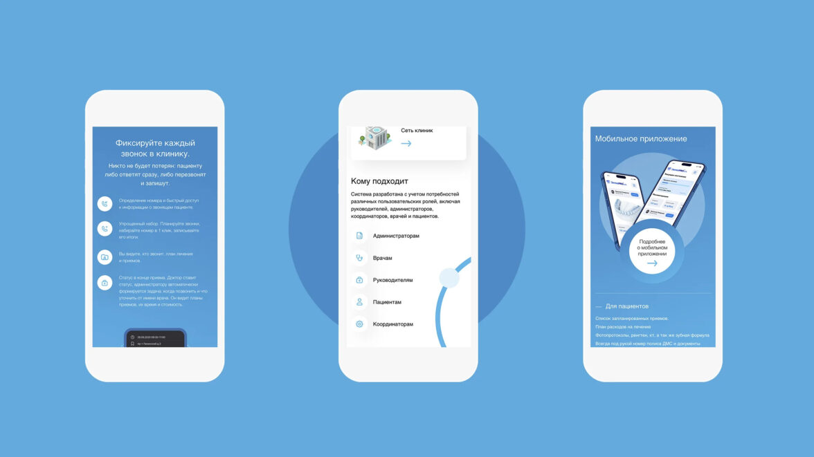 Всего реализовано 8 пользовательских сценариев и 24 лендинга функций, среди которых: электронная медицинская карта, зубная формула, онлайн-запись, аналитика, маркетинг, расчет зарплат и многие другие.