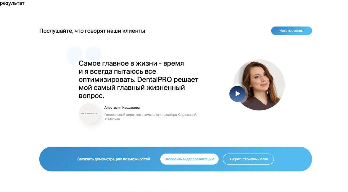 Дополнительно мы внедрили контекстные отзывы — живые кейсы, где реальные пользователи рассказывают, как конкретные модули или возможности продукта помогли их клинике.