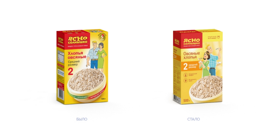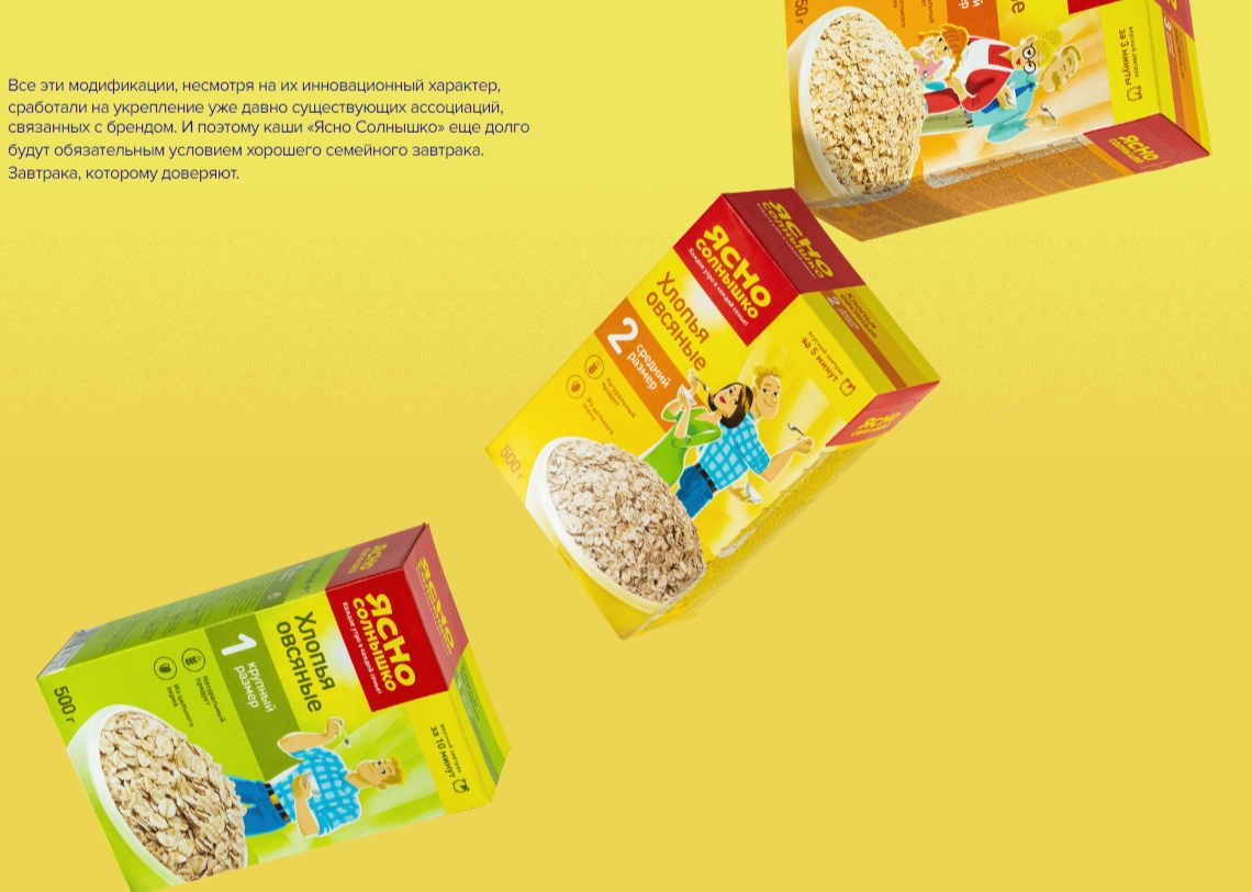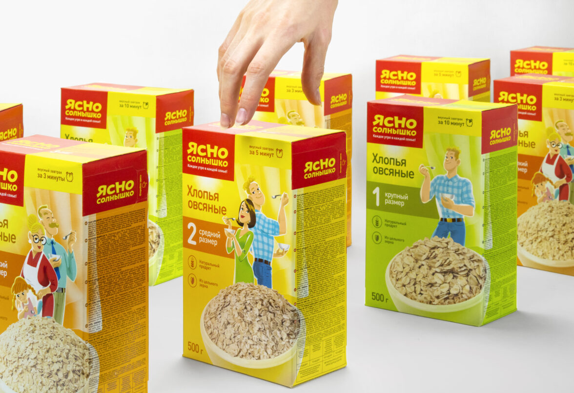 Элементы дизайна упаковки стали меняться в пользу динамичности, чтобы передать атмосферу бодрого утра. С этой же целью были перерисованы бренд-персонажи «Ясно Солнышко» — семья Овсянкиных. Характеры героев не подверглись корректировкам, но благодаря новой иллюстративной технике они ярче раскрылись перед покупателями. Члены семейства стали походить на настоящих анимационных персонажей, которые вот-вот начнут двигаться.
