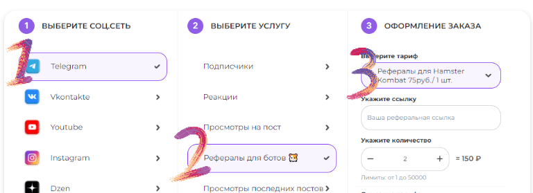 Найдите карточку «Рефералы для Hamster Kombat» и нажмите «Купить». Укажите свою реферальную ссылку и количество рефералов. Создайте заказ и следуйте инструкциям на экране.