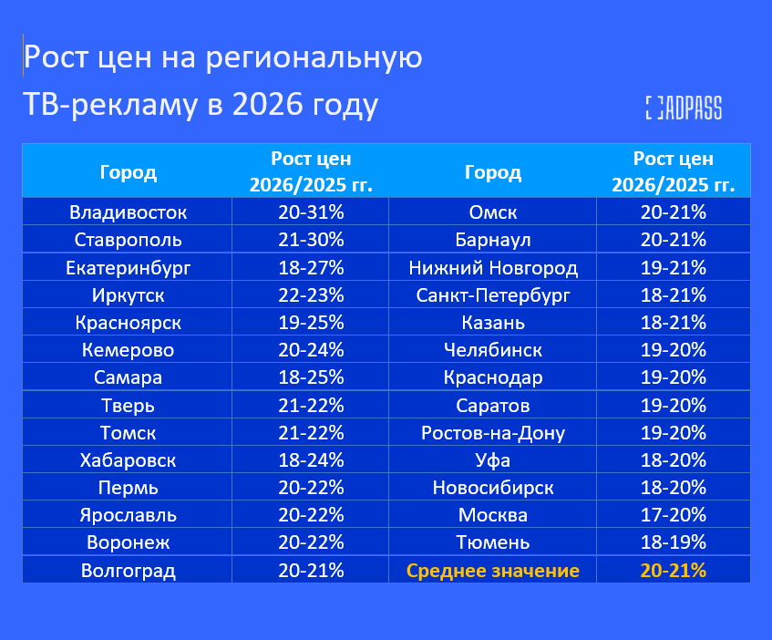 В 2026 году базовые цены на телерекламу в регионах поднимутся на 20-21%, что ненамного ниже, чем в федеральном эфире (+27%). На прошлой неделе Национальный рекламный альянс (НРА) опубликовал обновленный калькулятор медиаинфляции на ТВ, и медиаагентства специально для ADPASS рассчитали показатели по ключевым городам. Сильнее всего в 2026 году вырастут цены на размещение ТВ-рекламы во Владивостоке (+20-31%), в Ставрополе (+21-30%) и в Екатеринбурге (+18-27%). Замыкают список Тюмень и Москва, в которых размещение будет стоить дороже соответственно на 18-19% и на 17-20%.