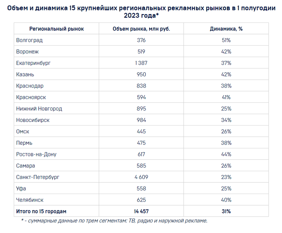 В первом полугодии 2023 года объем отечественного регионального рекламного рынка превысил 21 млрд руб., что на 25% выше показателей аналогичного периода прошлого года, подсчитали в Ассоциации коммуникативных агентств России (АКАР). Двузначную динамику роста в регионах показали все сегменты за исключением прессы. За год 15 крупнейших региональных рынков в общей сумме увеличили свои рекламные бюджеты на 31%.