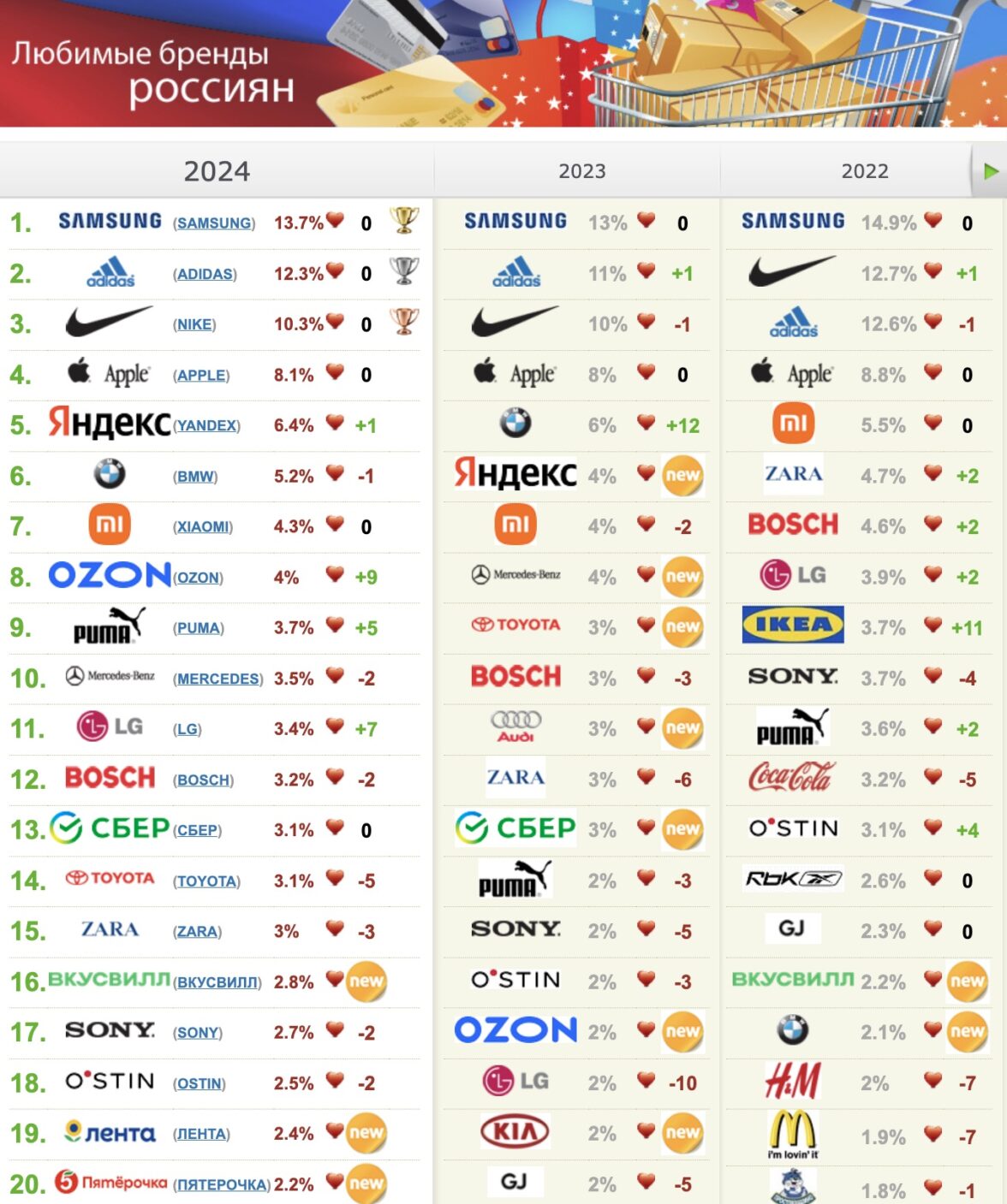 В отечественном рейтинге из года в год не меняется четверка лидеров. На первом месте — южнокорейская Samsung. В Китае он даже не попал в первую сотню. Россиянам последние два года больше нравится Adidas, чем Nike — китайцам наоборот. Китайский лидер Apple в России на четвертом месте, Xiaomi в российском рейтинге на седьмой строчке, тогда как в китайском — на третьем. В обеих странах бренды смартфонов и спортивной одежды и обуви — на самых высоких строчках в рейтингах. Любимые бренды китайцев — чаще всего китайские, в том числе в топ-20 рейтинга, тогда как в российском топ-20 преобладают зарубежные, хотя отечественных с каждым годом в него попадает все больше. В России самый высокий показатель среди отечественных компаний — у «Яндекса» (5-е место), в Китае Huawei на второй позиции. В российском рейтинге нет отечественных брендов смартфонов, спортивной одежды и обуви, компьютеров. Составители рейтинга OMI обращают внимание на следующую деталь — только одна компания, попавшая в первую четверку, не заявляла о свертывании бизнеса в России — Samsung.